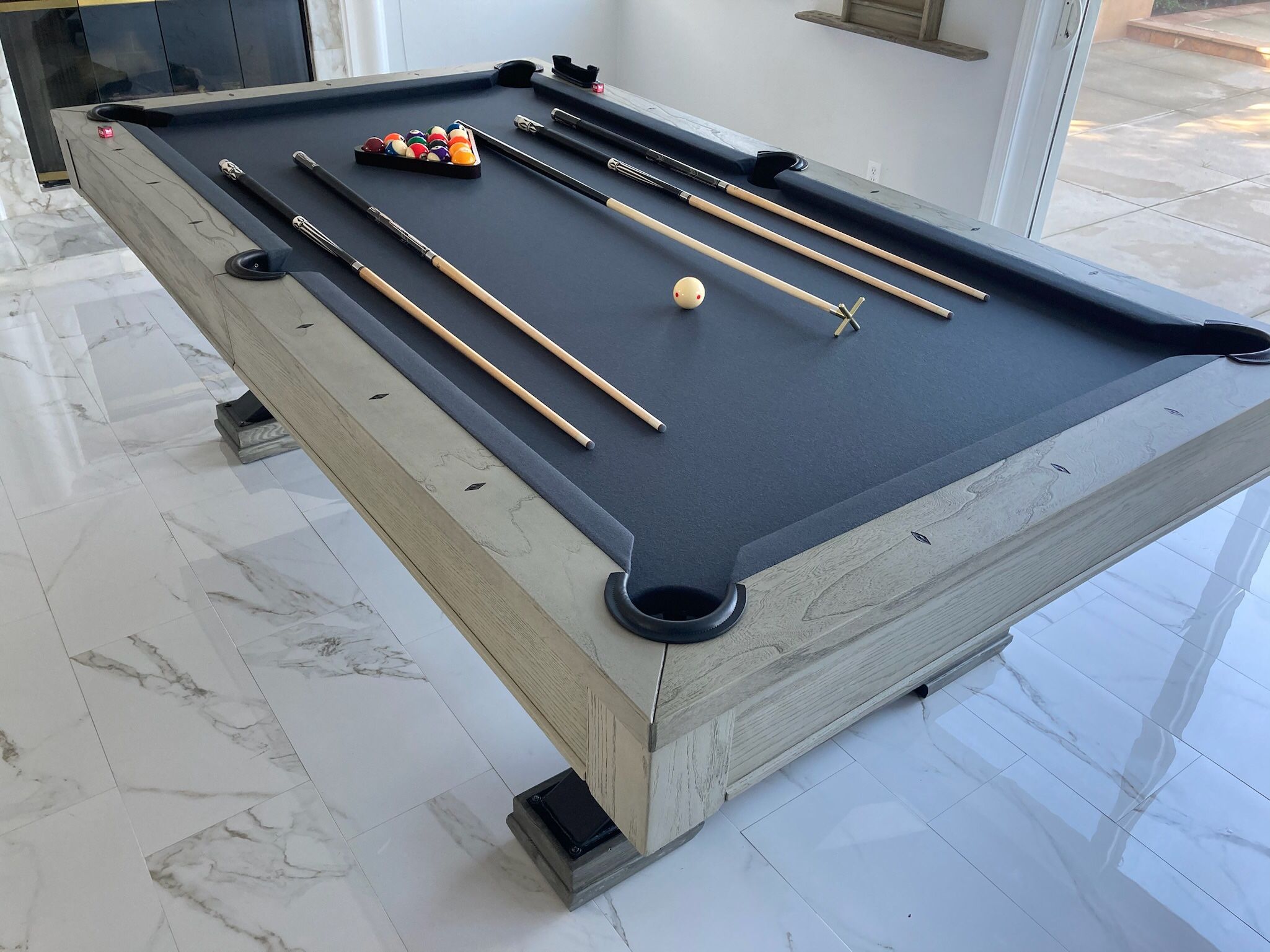New Slate Top 3 piece 1 inch slate! Now only $3,150!! All tables available in 7 feet or 8 foot (standard size) Available in 4 Different Solid Wood Finishes; black finish. Chocolate. Antique walnut finish & Grey stone finish. with black metal legs FREE delivery & set up!!! That will include first floor delivery (upstairs is extra), your choice of felt color. Total $3595 out the door tax included and a deluxe accessory kit. Retail is $5500. Also see our other pooltable ads, click on profile by picture to see other ads 4 piece matching Dining Tops Available! Turn your pool table into a dining table for just $975 additional! Text us with questions and place a phone order! No deposit required! $0. See it on delivery & confirm you love it! If you don’t, we’ll bring it back and you owe $0. Nothing owed!! Payment is due once we assemble, level the table & you’re 100% satisfied! Come see them in Person! We’re located in Mission Hills! Available by appointment! Or just place a phone order No deposit Needed!