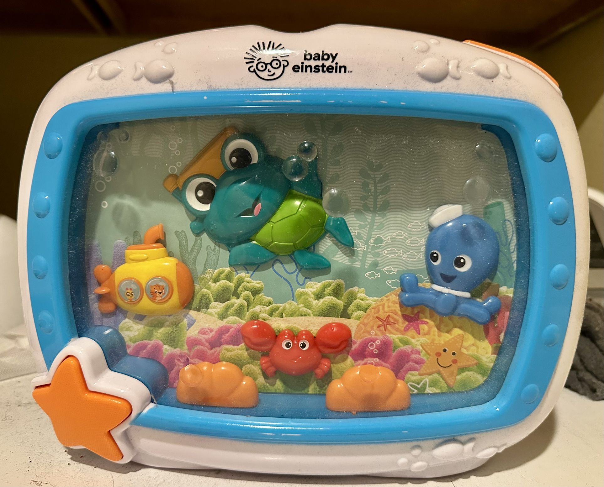 Little Einstein’s Crib Aquarium. This toy is very soothing for most infants, we actually used it in the car for my daughter. It lights up & the toys move around to music and relaxing water noises. It does come with a remote that can turn it on and off from close distances. This will need batteries.