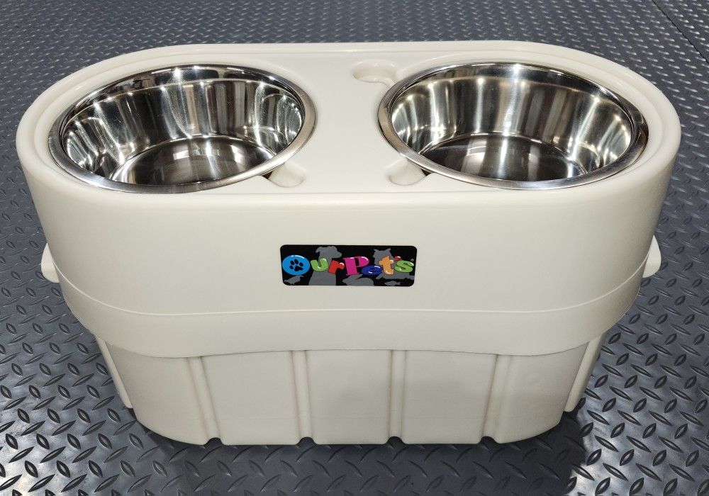 Lightly used store-n-feed elevated dog food feeder in excellent condition made by OurPets. Includes two 8.5 inch stainless steel bowls and built in spill ridge to prevent spills. Storage compartment under dishes can hold up to 15lbs of food. Ideal for medium or large dogs. Feeder adjusts from 8 inches to 12 inches tall.