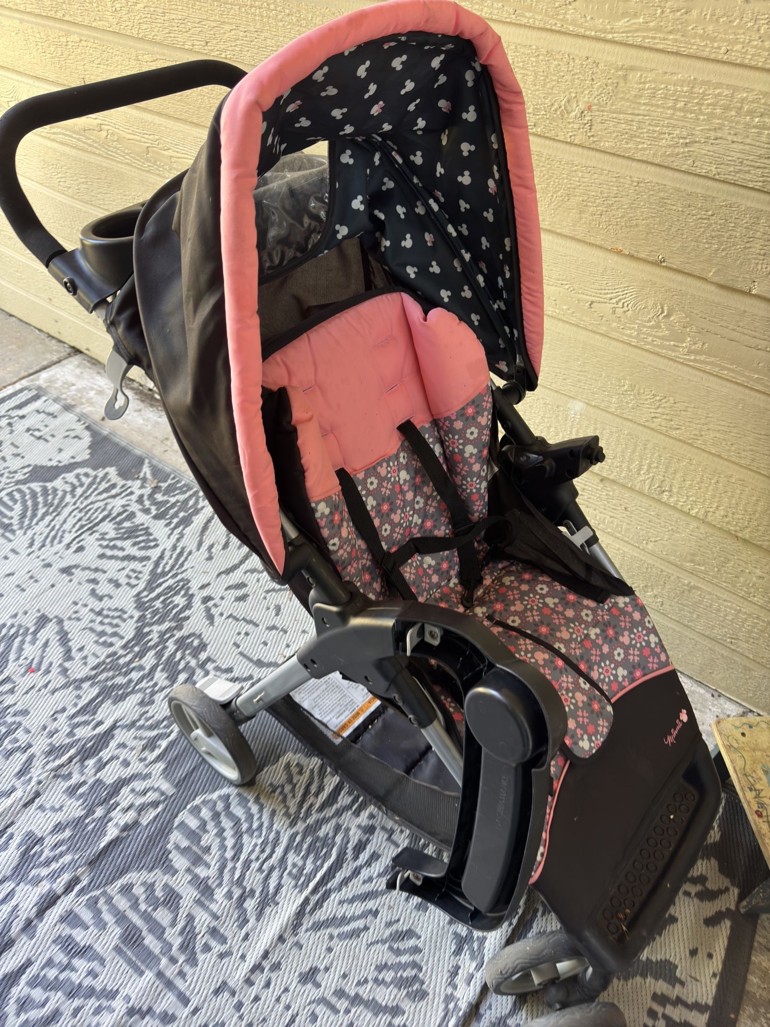 Minnie mouse stroller don’t use it anymore one of the wheels messes up occasionally but just gotta straighten up.