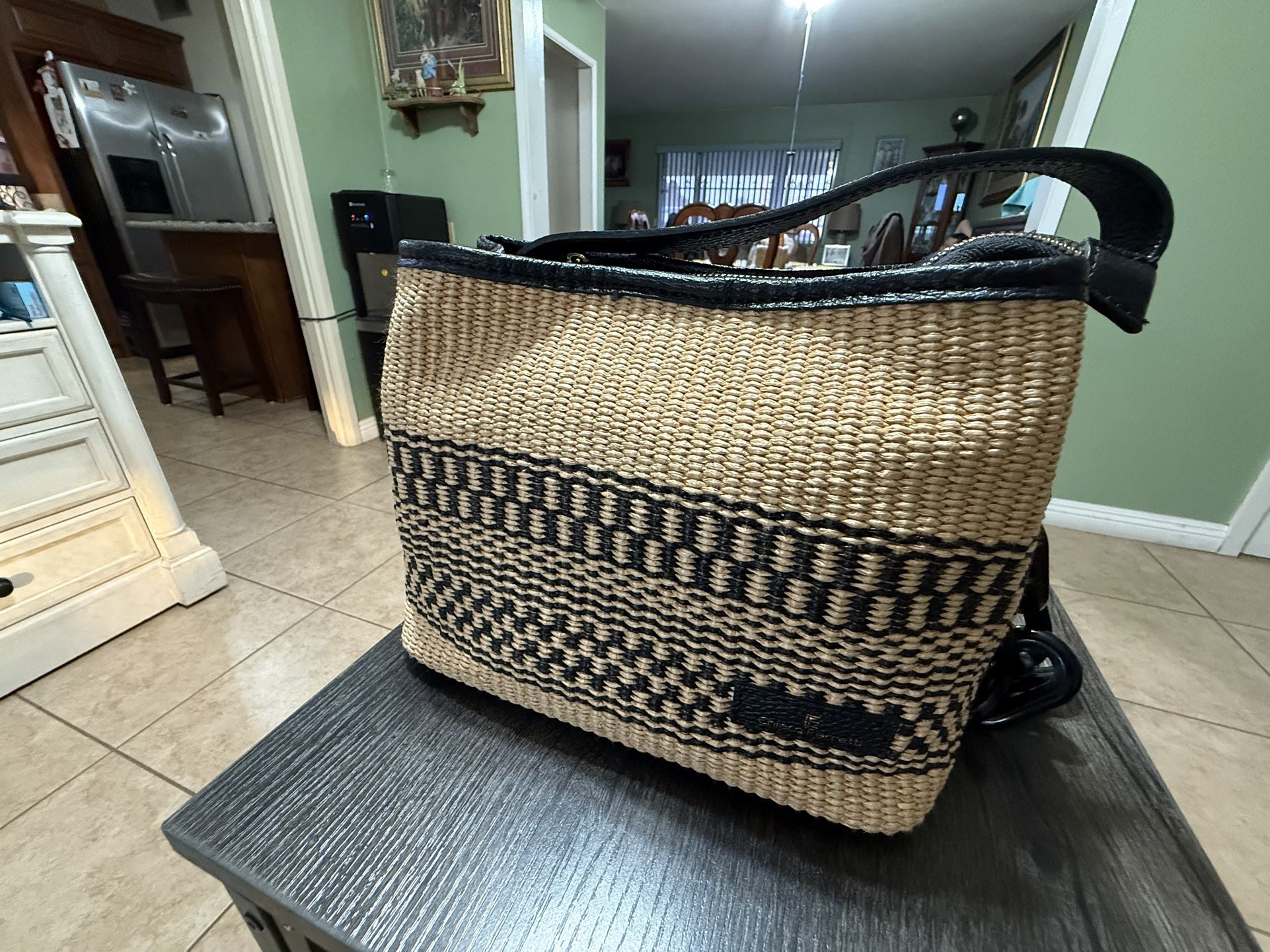 This stylish, structured handbag features a woven straw or raffia body in a natural beige/tan hue, accented with bold black patterns. The design is perfect for a chic, summer or resort-wear look. Woven straw/raffia body with black leather trim and strap. Natural beige/tan and black. Features a distinct geometric pattern woven into the center band of the bag. Structured, rectangular shape, likely a shoulder bag or crossbody (strap visible).