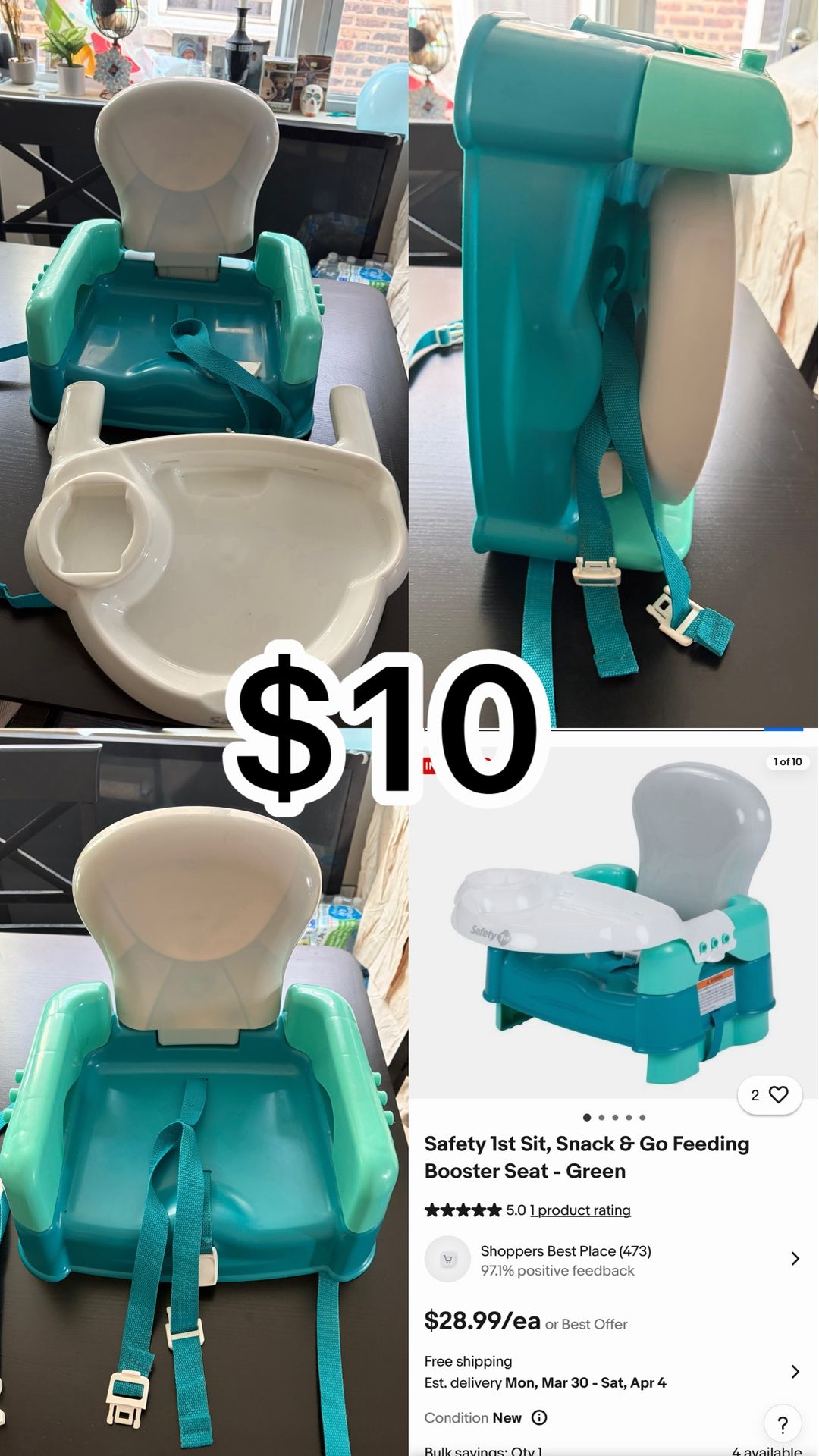 1. Booster seat- for $10. 2. Carseat w base, baby trend- for $40. 3. Bedside rocking bassinet- for $50. 4. Car seat stroller from TikTok for $80. 5. Baby trend 4 in 1 playpen- for $100 6. Evenflo double stroller w car seat and base- for $150 then I also have a rocker and a walker available for free with any one purchase if you’d like. Everything is obo except booster seat!