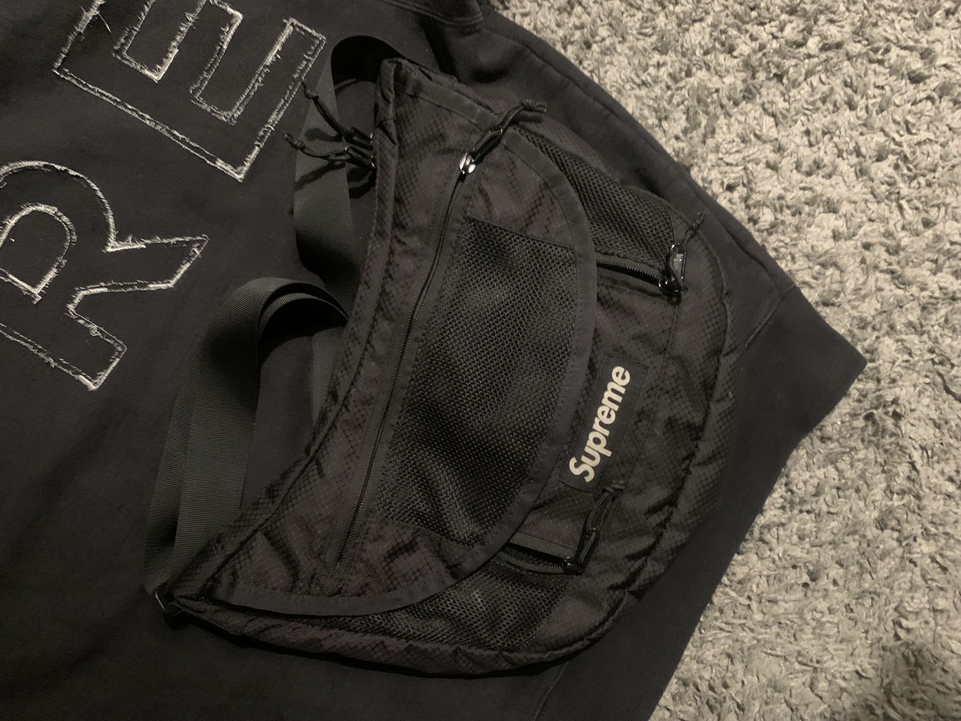 Durable black Supreme shoulder bag. Made with Cordura fabric. Has an adjustable strap and a mesh pocket on the front. Multiple zipper compartments.