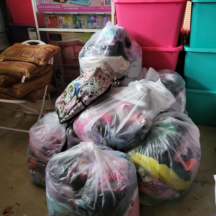 Gently used Girls Clothing Bags and a bonus Justice book bag for tween Girls- Sizes 12 to 14 . Coats, sweaters,jeans, jackets, tees, dresses, pajamas, hoodies, joggers, shorts etc. and Nike air force one and dunk low and crocs size 6. And a that girl lay lay, twin/full bed in a bag comforter set. An assortment of clothes and accessories for the little fashionista in your life or several fashionistas in your life. A little for every season. Calling all tween/teen girls now. Clothing from Justice aka Limited Too, Nike, Crocs and many more tween to teen designers 8 bags and a bonus book bag