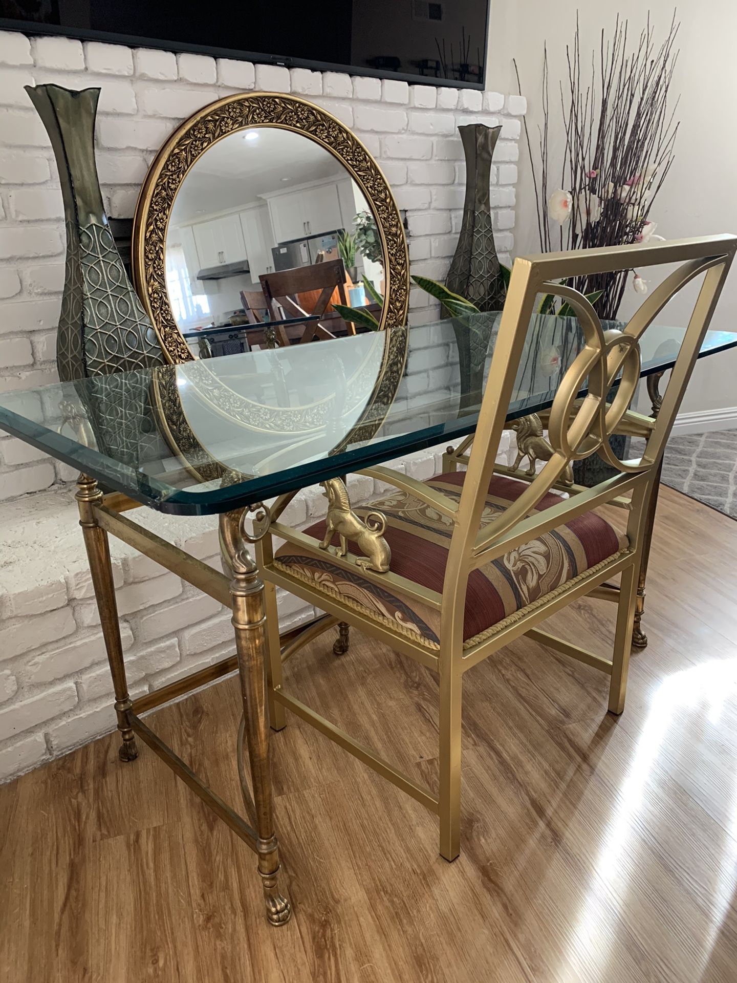 A Stylish brass Lion head with glass Top and claw foot desk Wear consistent with age and use. Glass may have a minor chip at corner point. But overall it’s a very nice piece. Glass Dimensions:56” W x 28”D x 1/2” H Base Dimensions: 29 H x 45 Wx 24” D