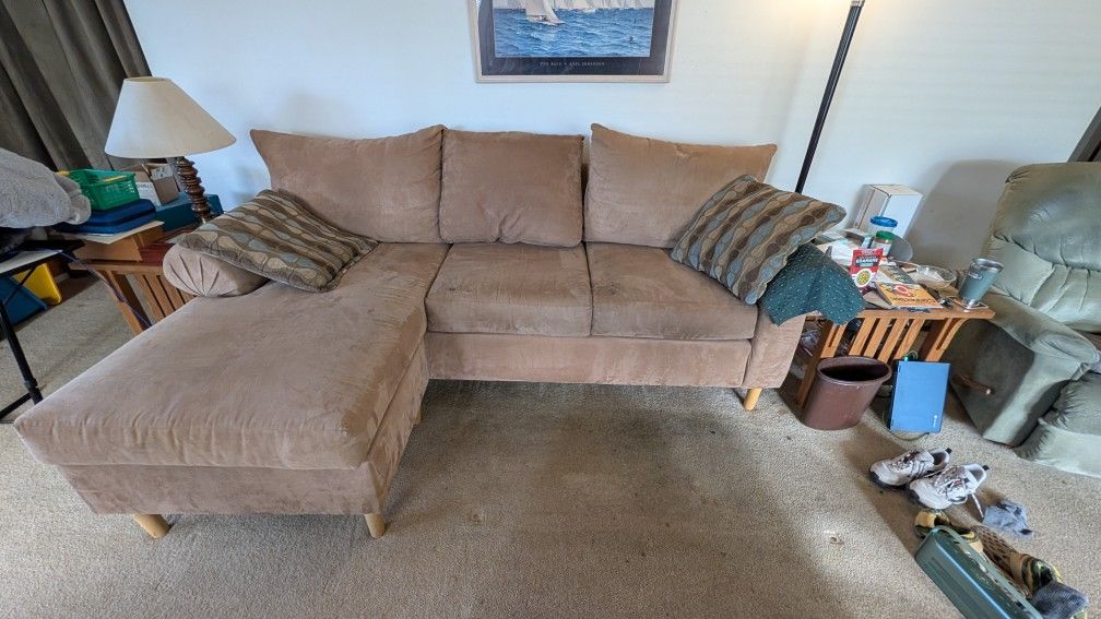 Light brown sectional. 100" x 64" at long side. Long side is reversible to other side. Very solid and comfy. It does have some staining on the seat cushions. Have been washed but still stained.