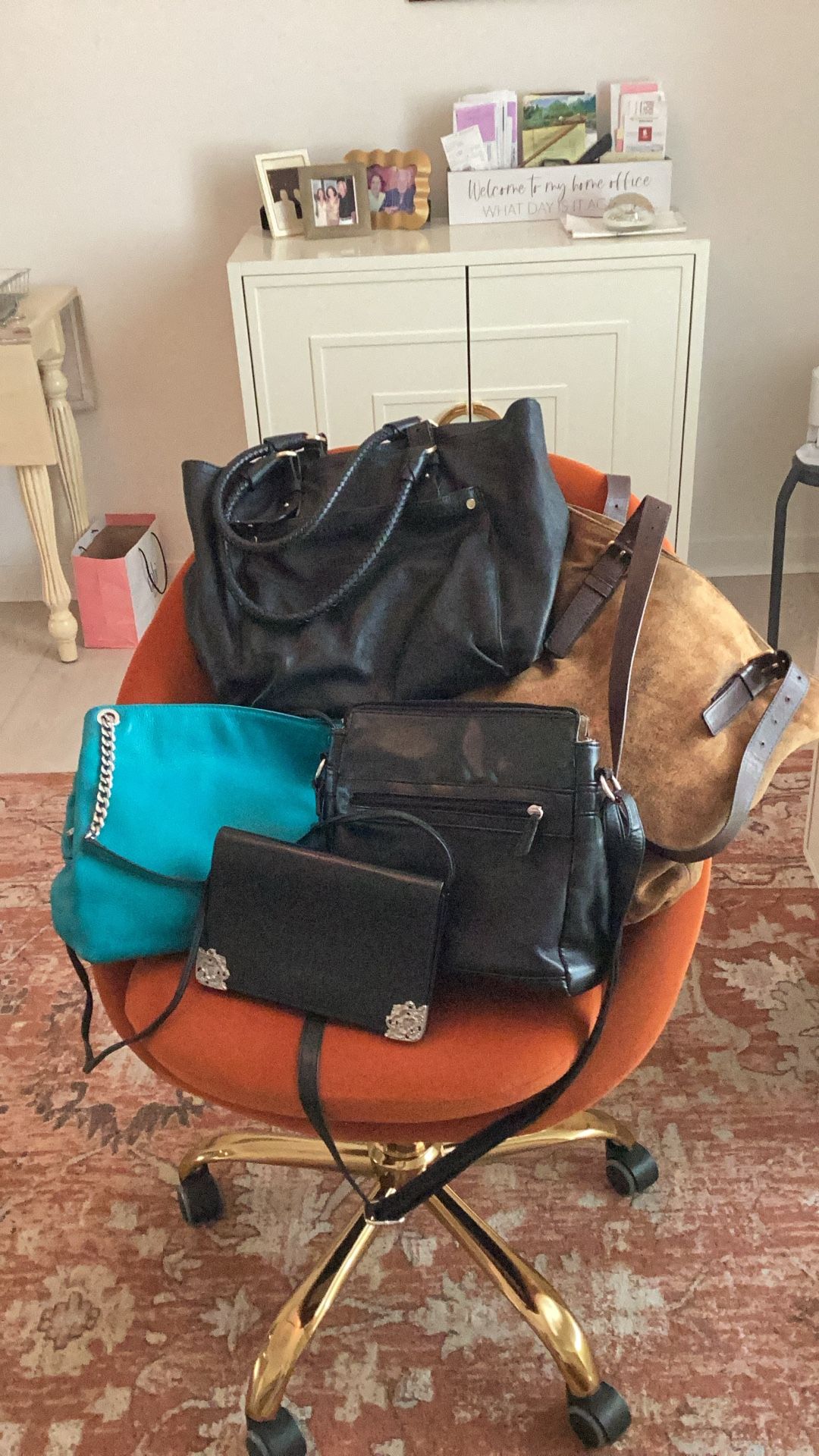 ALL 50% -75% off, *barely used* 1. Cole Haan large black pebble leather satchel, $129 2. Michael KORS large distressed Carmel/ brown suede with leather straps, $129 3. Michael KORS turquoise pebble leather 3 compartment med. size, chain & leather straps $69 4. Ann Turk small blk. pebble leather cross bag with silver design on corner flap $39 5. Bernini blk. leather cross bag with many compartments $ 29