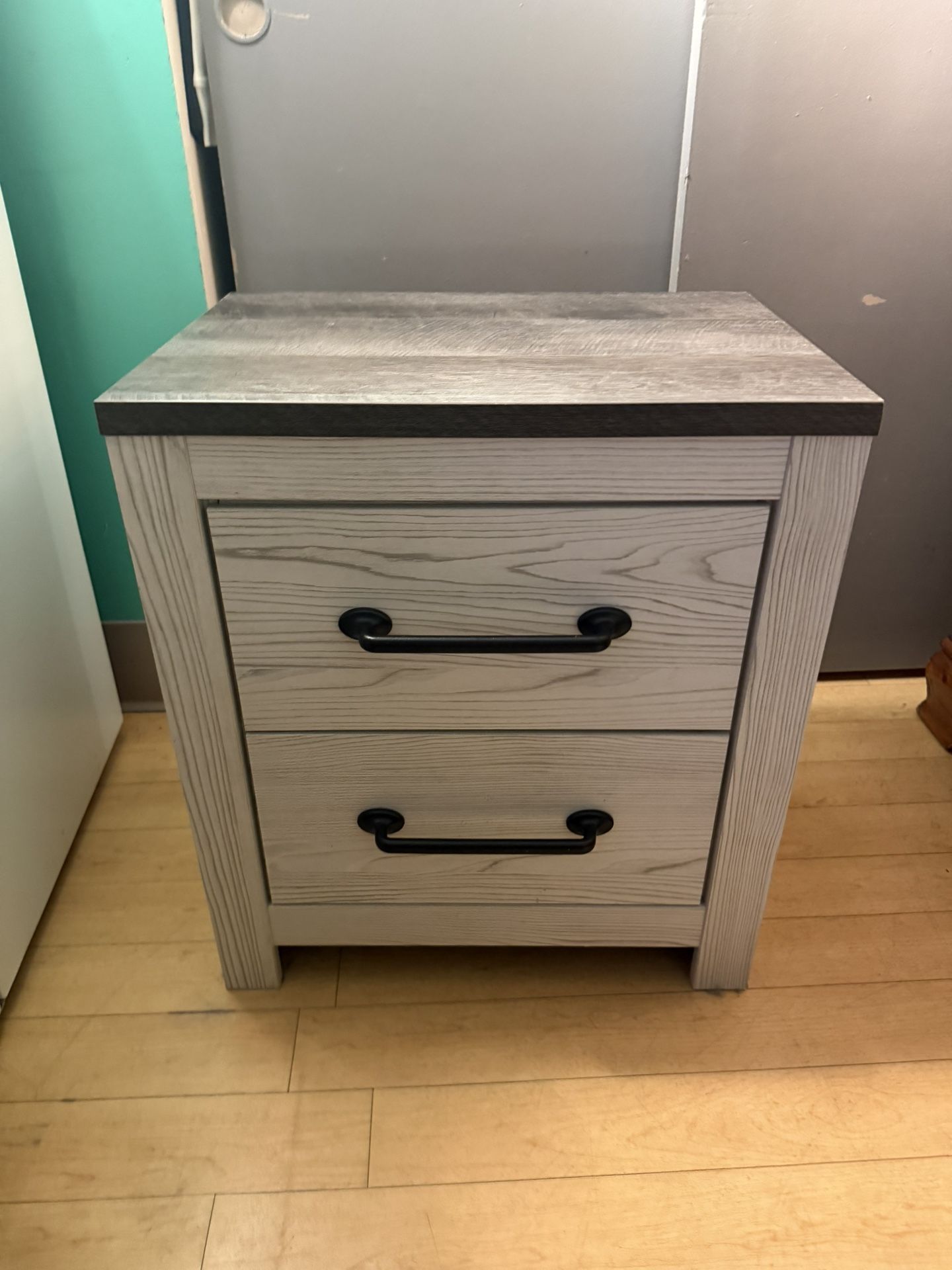 Only 1 month old and in brand new condition! This stylish nightstand features a two-tone wood finish light ash body with a dark gray top and sturdy black metal handles for a clean/modern look.