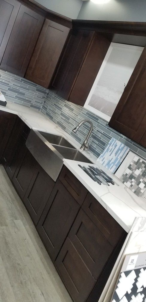 Cabinet come with solid wood cabinet door dovetails. Drawers frame, drawers; side panel and Solid plywood cabinet box. Countertops quartz. We offer complete kitchen, bath, and home remodeling including materials . No cost Estimates.