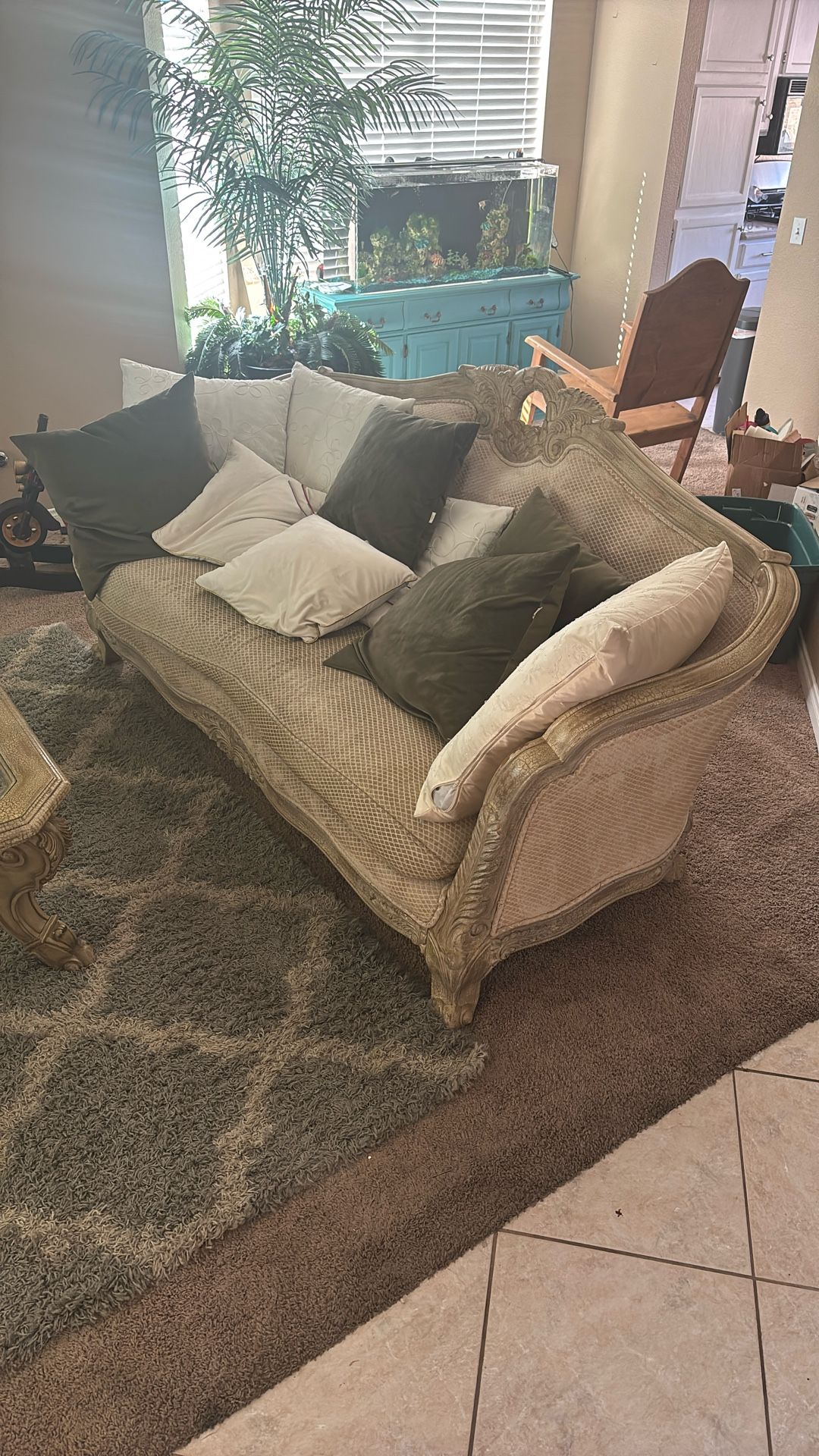 Large square coffee table Round side table Large elegant couch Lamp. (Shade is cracked)