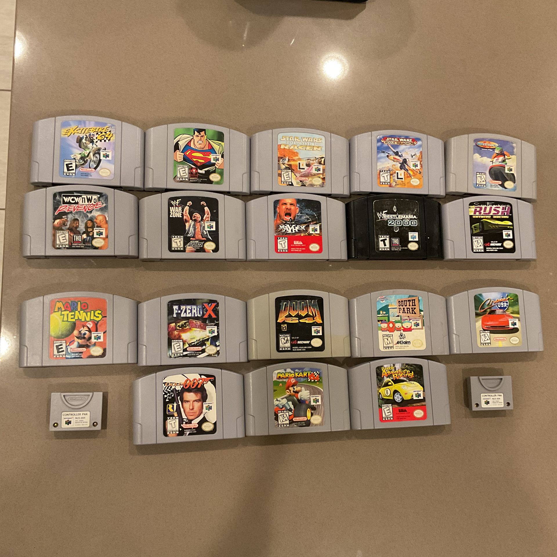 Prices below and firm. Pickup in Goodyear only. Memory cards $10 each Top 2 rows $10 each Mario tennis $20 Mario kart $45 Goldeneye $30 Doom $40 Fzero $40 Beetle racing $20 Cruise USA $15 South Park $20