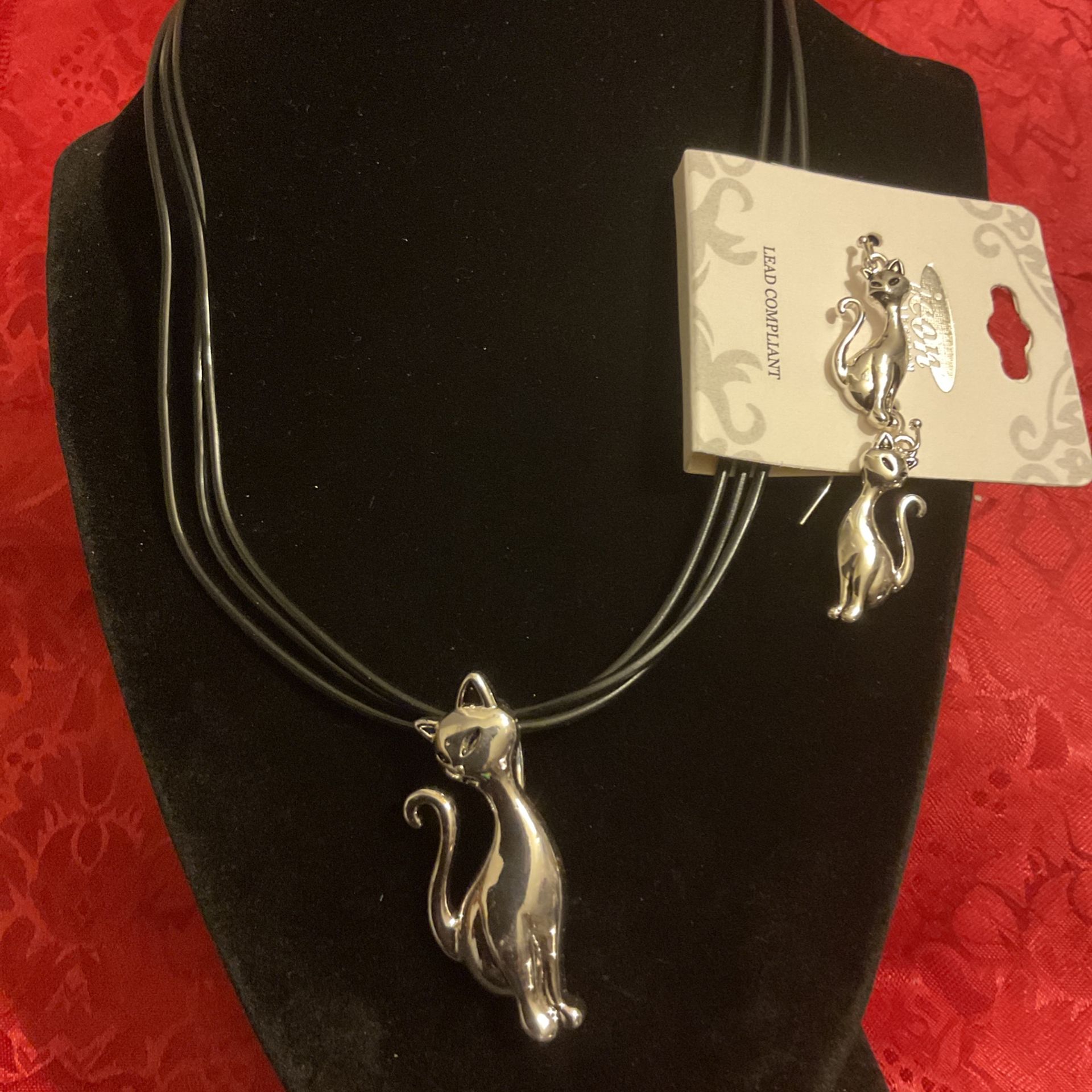 Leather Necklace With Silver Cat Pendant Set W/matching Dangling Cat Earrings,by ICON COLLECTION