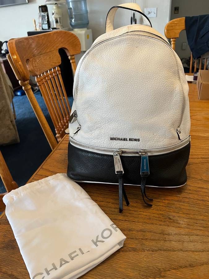 High desert newer Adelanto pick up- MK Michael Kors Ivory & black 2 tone Leather Design Medium Size Backpack w/ silver metallic accents, about 12 1/2” Tall with matching soft smooth satin feel drawstring dust-bag to store if wanted in great condition with no rips or stains very clean shimmer material inside with ivory white leather trim border edging with lots pockets with zipper & slip style sections on both sides. Main large area in middle & I didn’t fully fill inside to show how big as its a bit scrunched, $100 because it has Mk silver logo satin white scrunch bag.