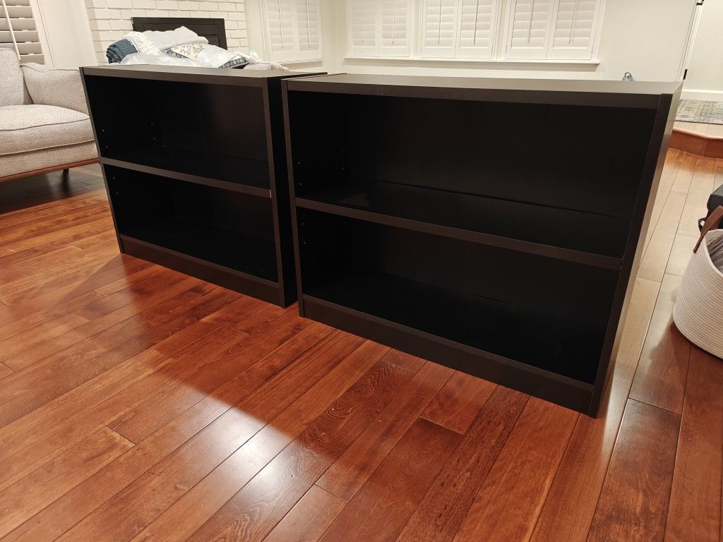 $40 each. Selling a pair of like new black bookcases. Purchased from Wayfair earlier this year. 37" wide, 30" tall, and 12" deep.