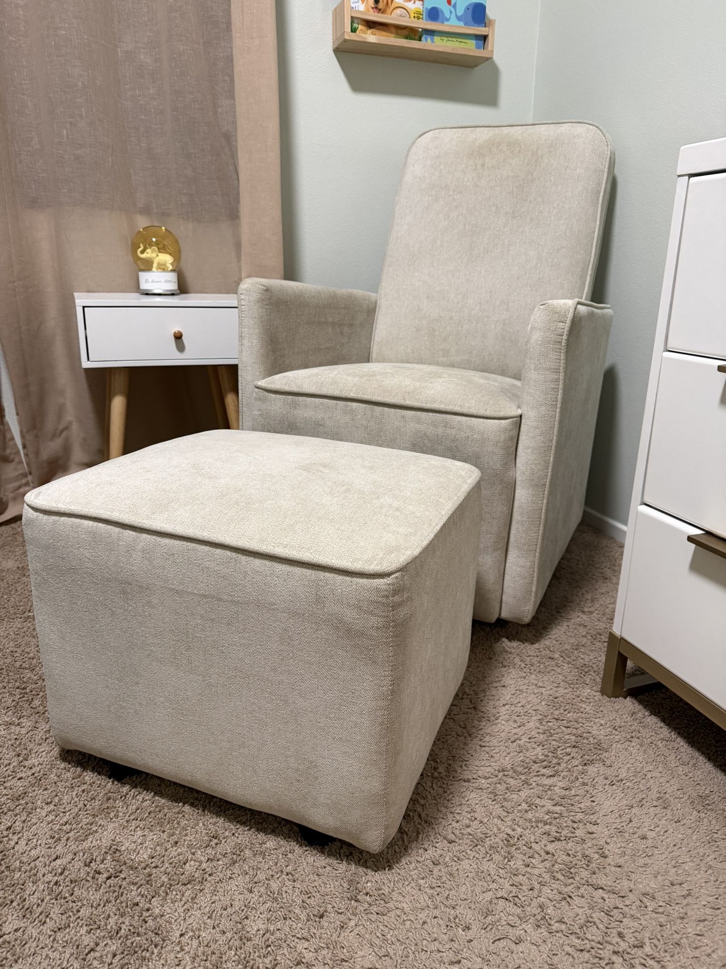Modern upholstered glider chair with matching ottoman in excellent condition. This chair is extremely comfortable and perfect for a nursery, reading corner, or living room. Originally purchased for around $450, but selling for $100 to free up space. Condition is basically like new with no stains, tears, or damage. The glider motion is smooth and quiet. Includes: • Glider chair • Matching ottoman Features: • Soft neutral fabric that matches almost any room • Smooth rocking/gliding motion • Comfortable armrests • Great for nursery, reading, or relaxing First come first serve.