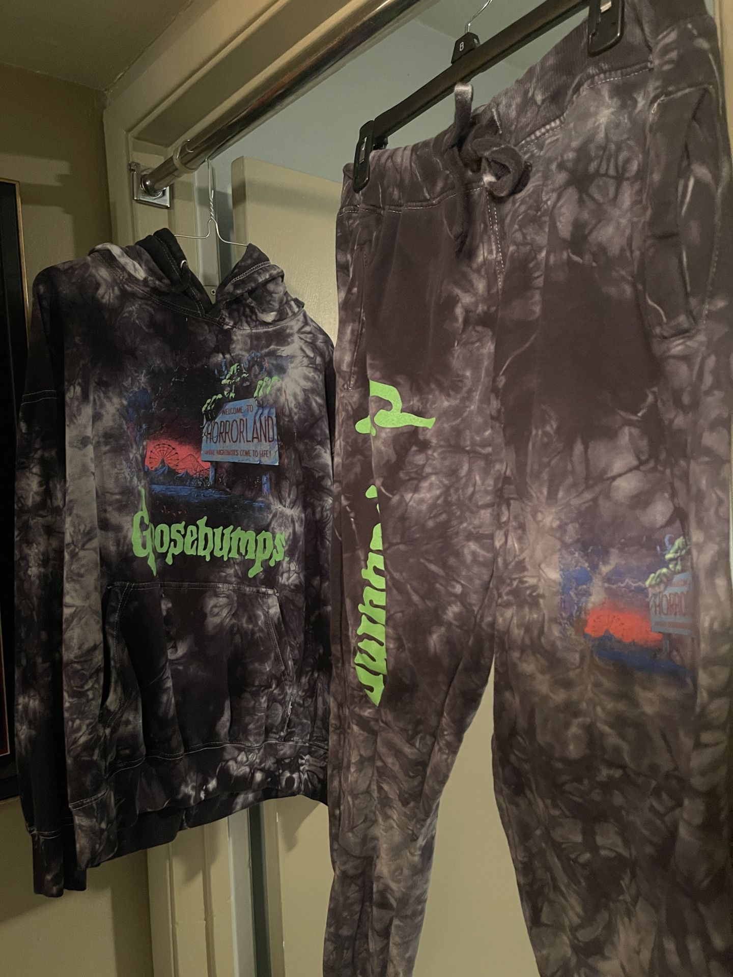 This combo SCREAMS! The Goosebumps One Day At Horrorland pullover hoodie and sweatpants combo really stands out and is perfect for any fan of Goosebumps and fashion with its acid wash style. Hoodie is a large, but honestly fits closer to a medium and the pants are a medium and easily fits waist size 32-34π