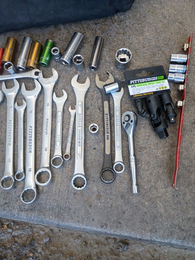 Dismiscellaneous ratchet wrenches miscellaneous sockets of a tool bag there's no sets of anything but there's enough to do if you need to do something