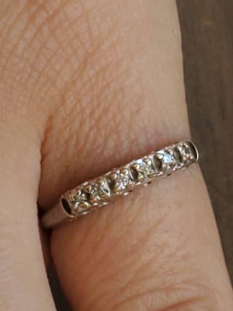 Vintage 14kt white gold diamond band. Ring size is 5 and is sizable by your local jeweler. Tested, polished, and steam-cleaned. Can ship, offerup holds your money until you check it. Priced to cover sellers fees when being shipped, 15%off for local pickups. Check out my other jewelry under my offerings :)
