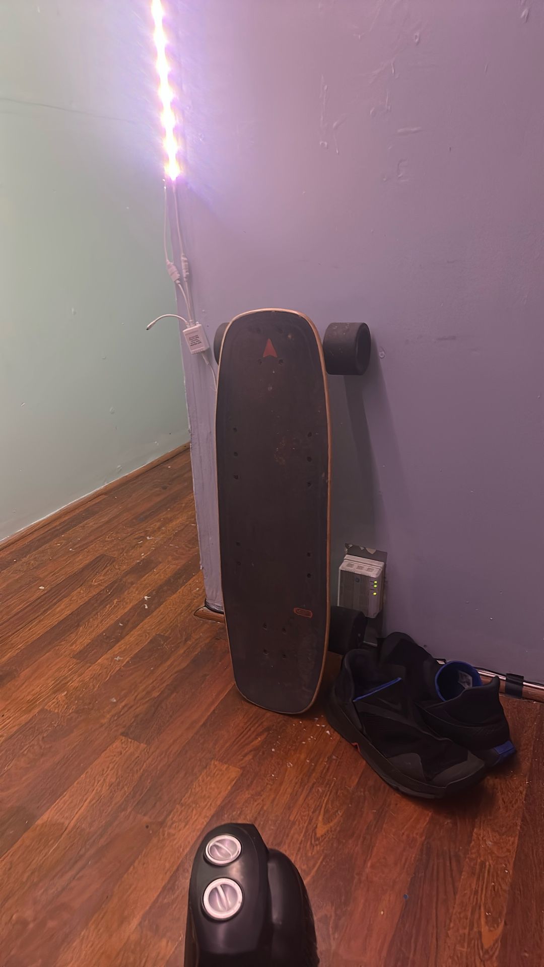 Meepo Electric skateboard goes up to 28mph. Distance of 12 miles. Comes with charger and controller.
