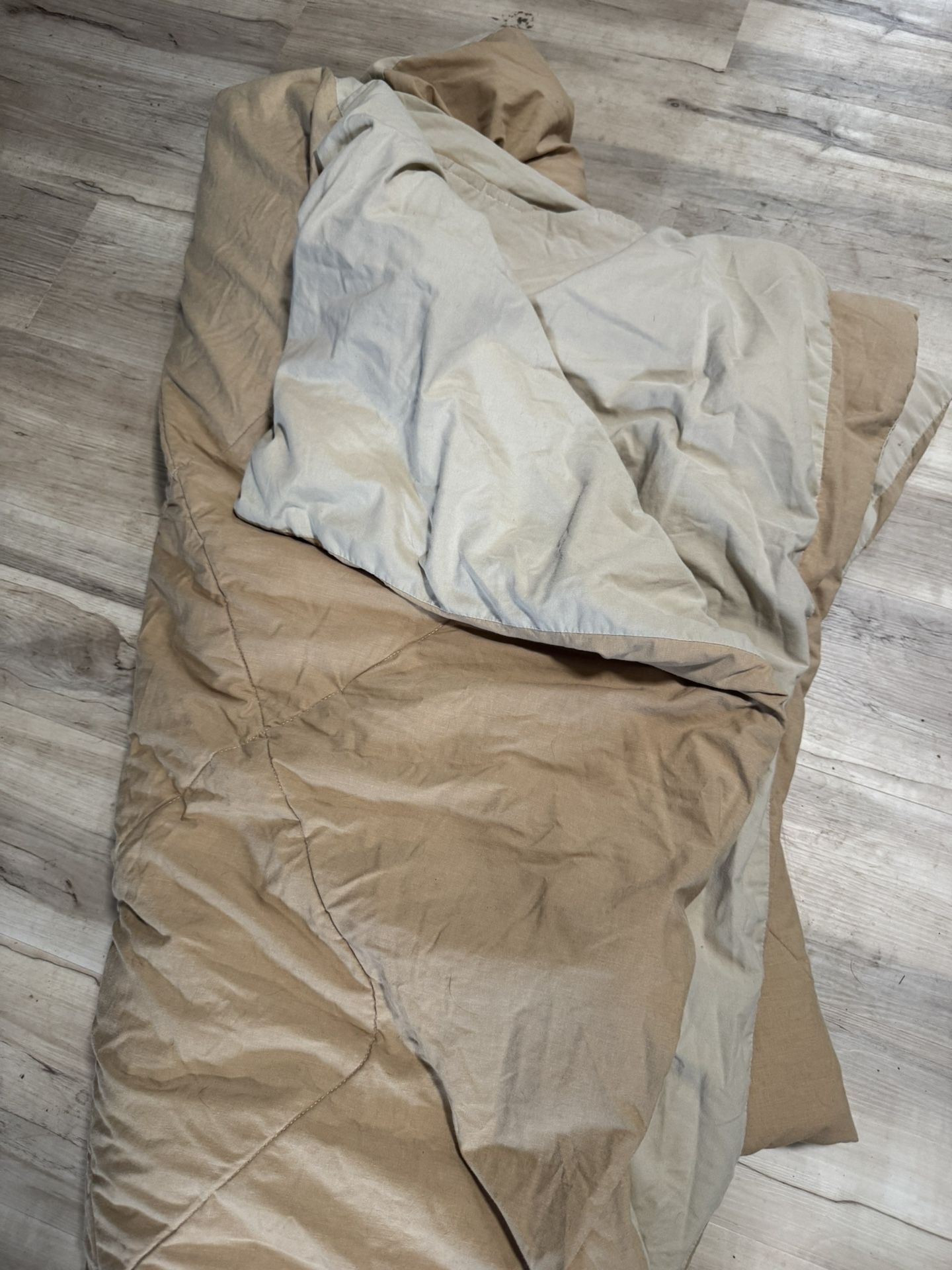 I believe this is a queen sized comforter? We used in our rv, but recently sold it, so this is ready for a new home. Pretty basic, but good size/weight. Darker camel/khaki on one side and lighter tan on the other. Pickup near downtown Snohomish.