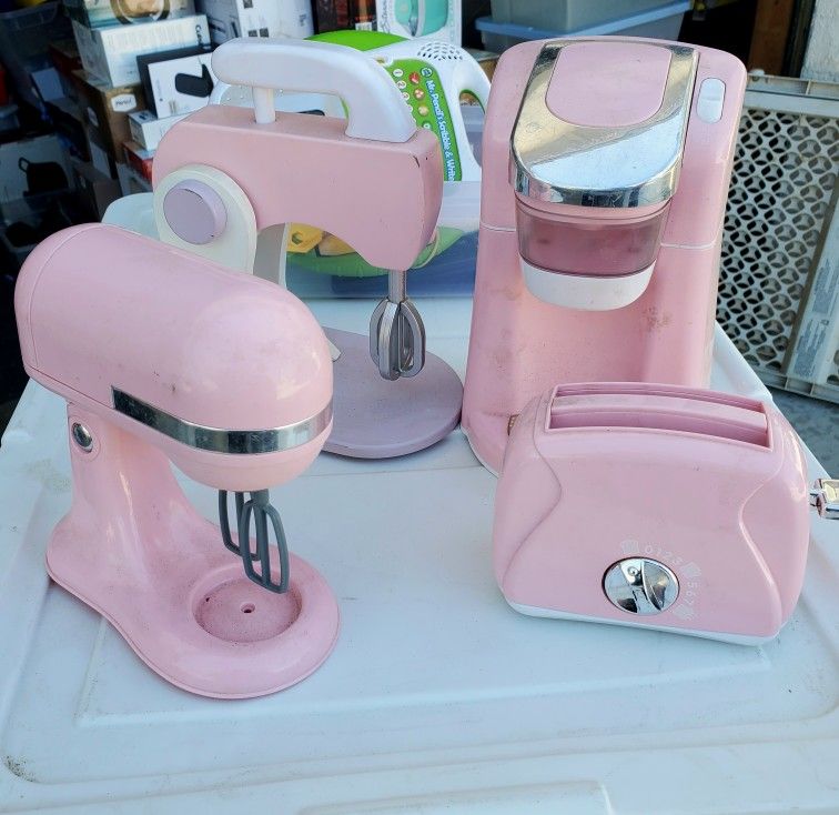 USED Playgo Pink Toy Kitchen Appliances - Pod Coffee Maker, Mixer, Toaster.. Good condition. Extra wooden mixer by Kid Kraft.