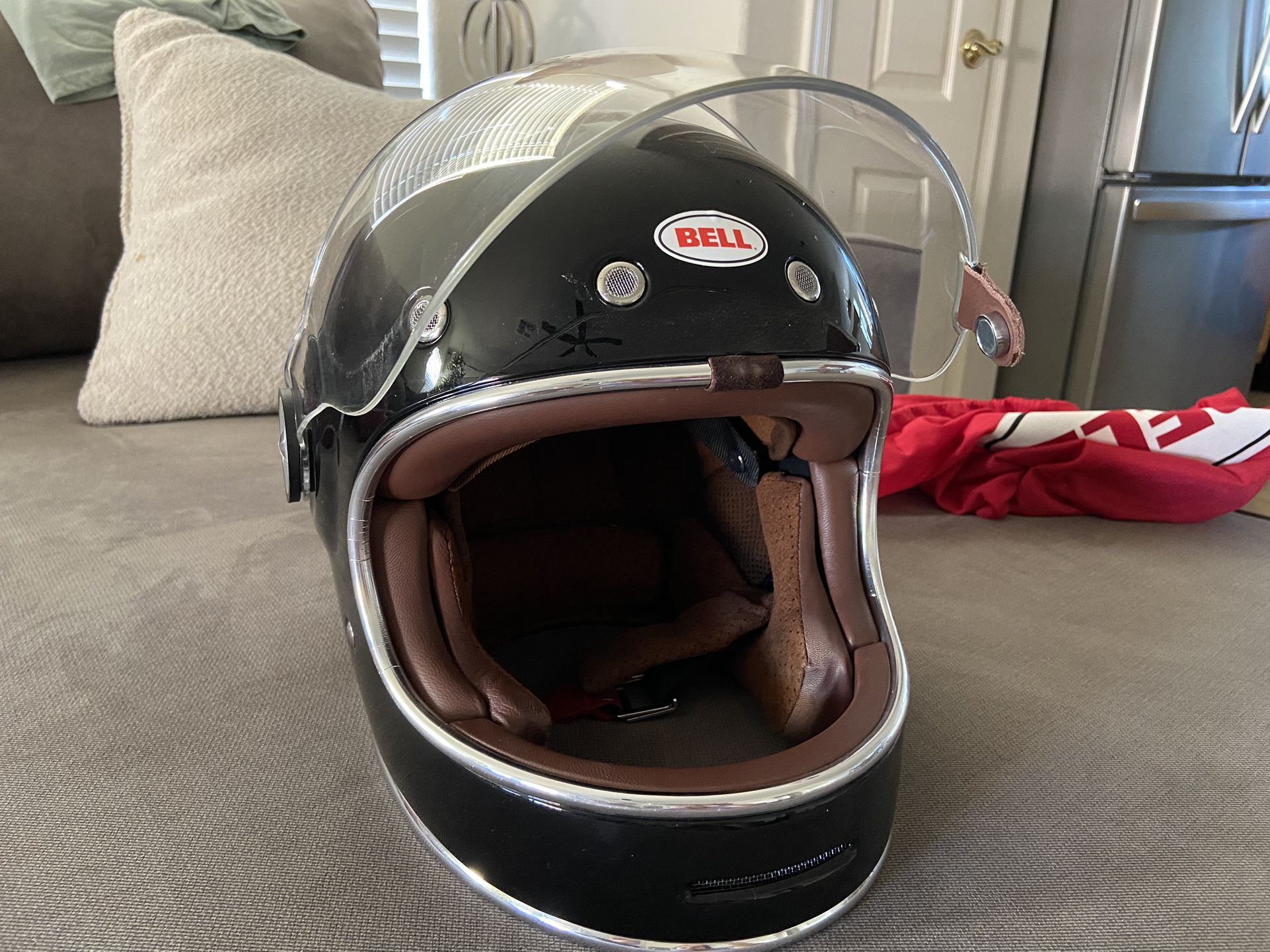 Retro Bell Helmet OBO Brown inside leather Clear shield Outfitted with scala rider smartpack motorcycle intercom. Missing charging cable.