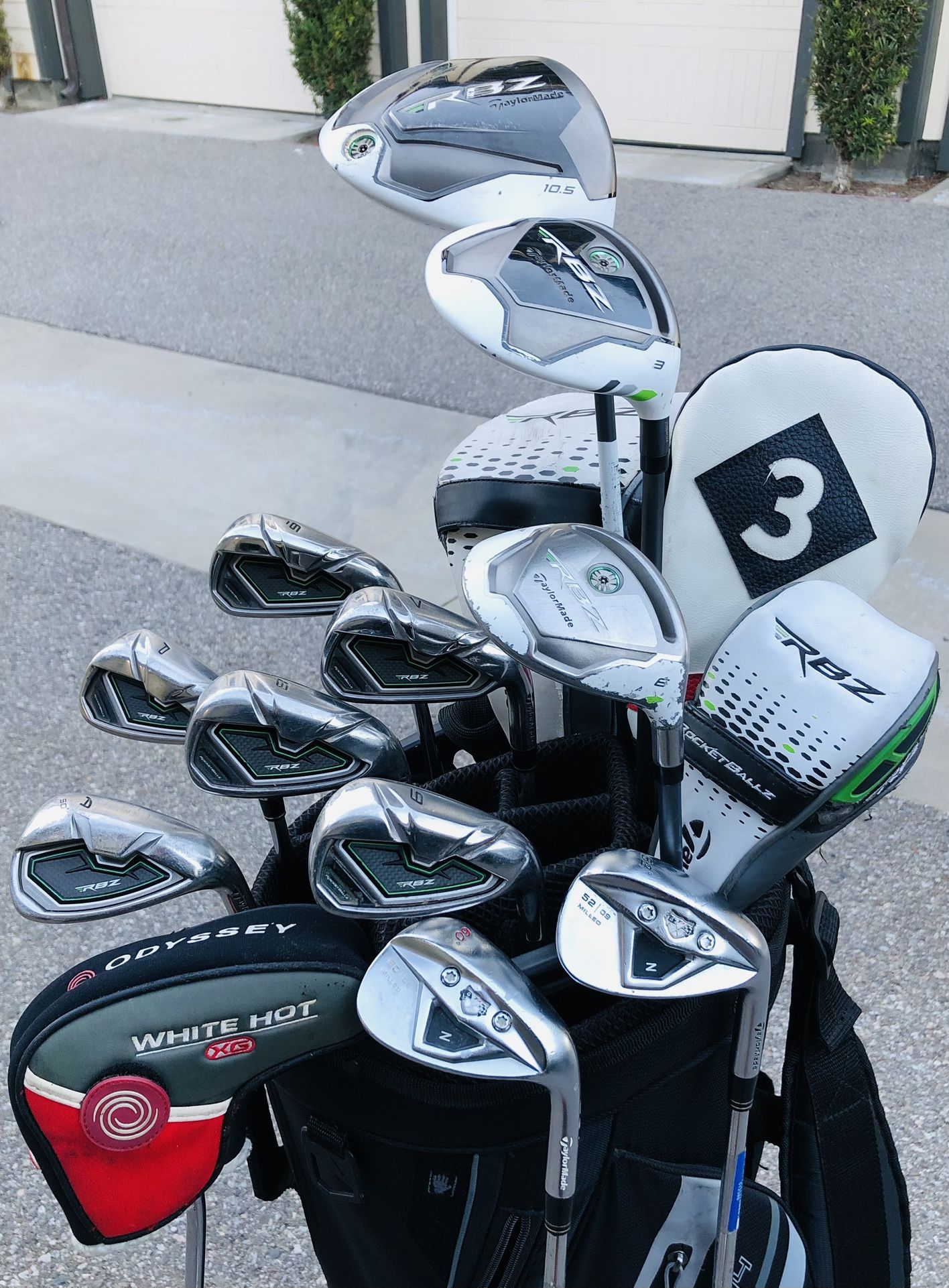 TaylorMade RBZ Complete Set 6-PW, AW Steel Shafts, TaylorMade RBZ Driver, Taylormade RBZ 3 Wood, Taylormade RBZ Hybrid, Taylormade 52* & 60* wedges, Odyssey Putter, Headcovers, Balls, Tees and a Golf Bag Included Right Handed….$550
