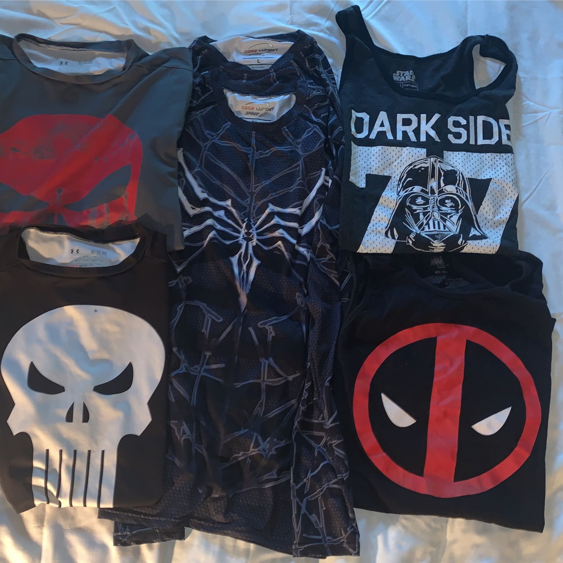 Type: Grey venom, Brand:Cody Lyndon Sport Size: Large & XL Type: black punisher compression shirt Brand: under armor Size: xl Type: gray punisher compression shirt Brand: under armor Size: xl Type: deadpool tank top Brand: Marvel Size: Medium Type: Darth Vader 77 tank top Brand: Starwars Size: Large