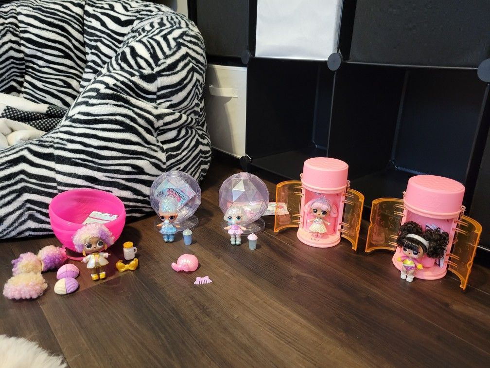 5 LOL Dolls and 2 are rare. The one on the far left is from the #Hairvibes series and is rare. The two that are with the pink cans are from the Hairgoals series and the one on the right is rare. The last two in the center are from the Winter Disco series. All 5 dolls are in excellent condition and are like new.