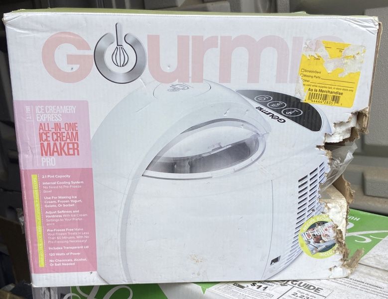 Gourmia Ice Creamery Express All-In-One Ice Cream Maker. Brand new in box! Box is ripped in the corner from storage, but you can see the product is perfectly fine. Retails for $129.99.