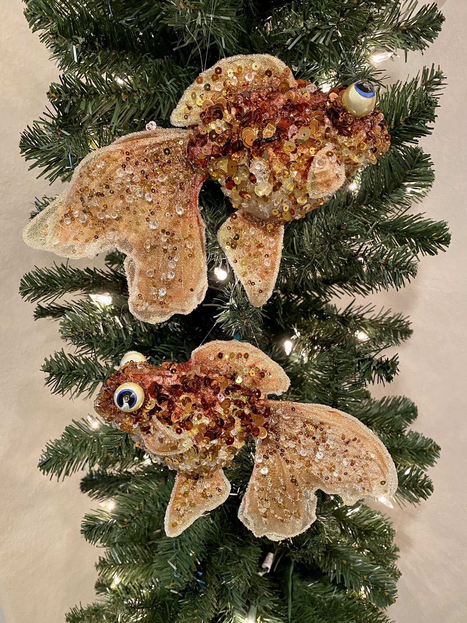 2 beautiful glitter goldfish 9 inches long Sold as set. Great addition to holiday tree or decor.
