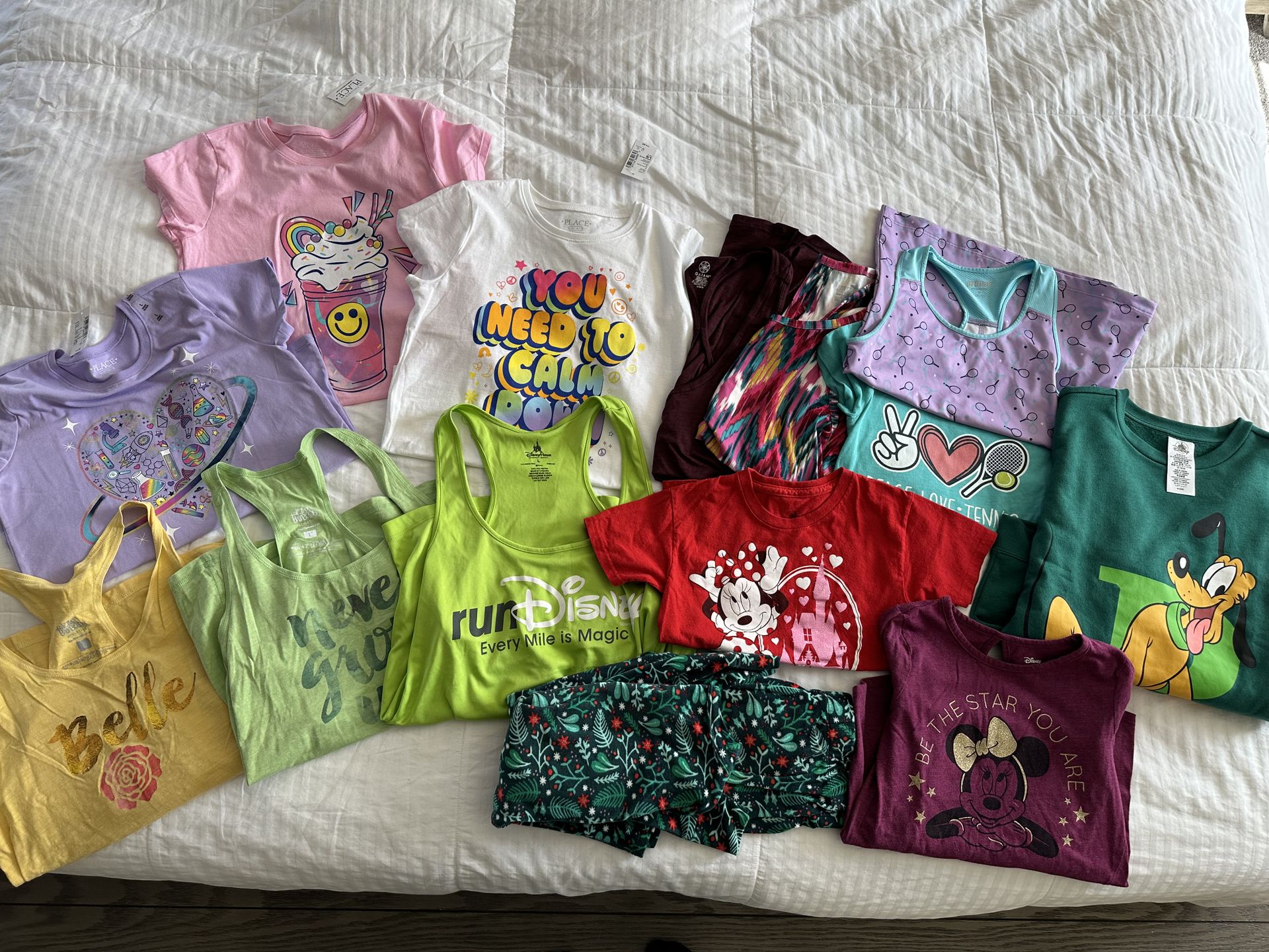 🌟 Children’s Place bundle of three NWT girl’s large 10/12 shirts, $15 🌟 Like new condition, no wash wear, super soft fleece pj set Cat & Jack size 10, $10 🌟 NWT Disney Pluto Sweatshirt 9/10, $20 🌟 Good condition long sleeve Minnie tee size 7, $5 🌟 Good condition short sleeve Valentine’s Minnie tee child small, $5 🌟 Child tennis 🎾 tops bundle, Prince racerback medium worn once + youth medium tee from Kohl’s worn once, $30 🌟 Adult active tops $10/each or $16 for both, Old Navy Active is Medium & GAIAM is Large, excellent condition 🌟 Set of 3 Disney themed Women’s Large racerback tanks, excellent condition, Raw Threads & Disney brand, one small snag as pictured, $50 for all
