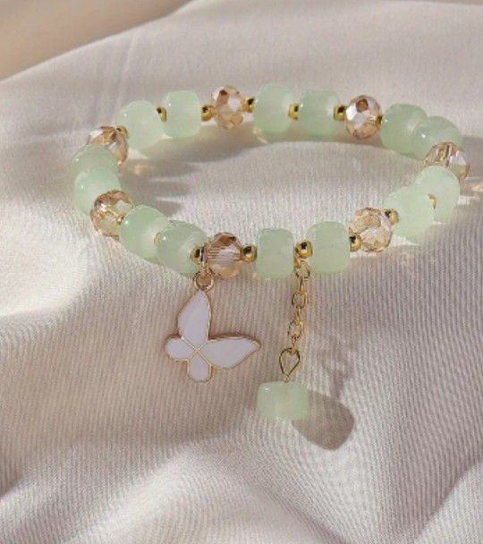 Butterfly Charm Bracelet. Women Bracelet. Hand Jewelry. Gold Tone Bracelet Stretches. Green Bracelet