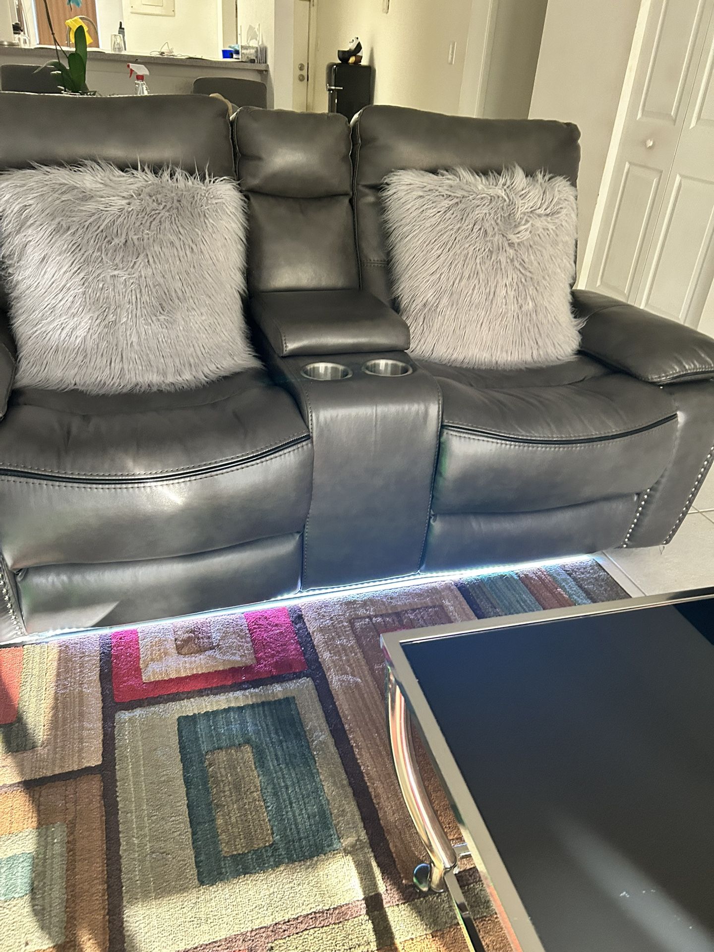 Two reclining sofas with two side tables and a coffee table, plus accessories. No scratches, everything is in excellent condition. I'm selling it because I'm moving. 850 firm price, it's a gift!