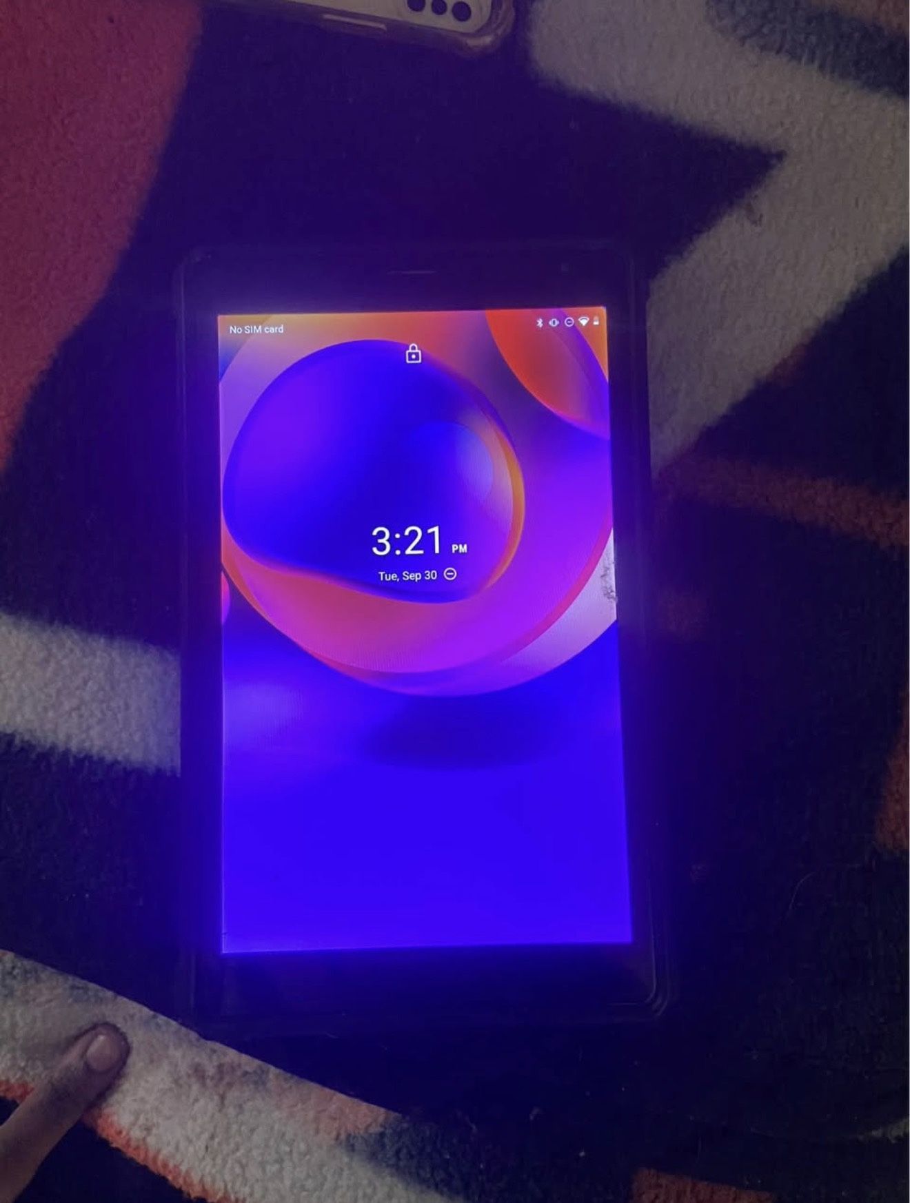 Black tablet in good working condition. Screen turns on and works well. Currently shows “No SIM card” so it can be used with Wi-Fi for apps, videos, games, and browsing. Great for kids, streaming, or everyday use.