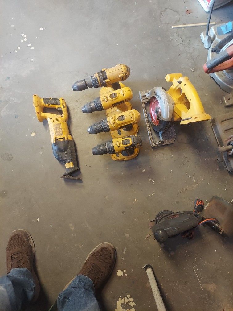 4 Dewalt drills 2 are hammer drills 1 recurring saw 1 circular saw all work but there no battery battery is 40.00 at home depot ot Amazon asking $50.00