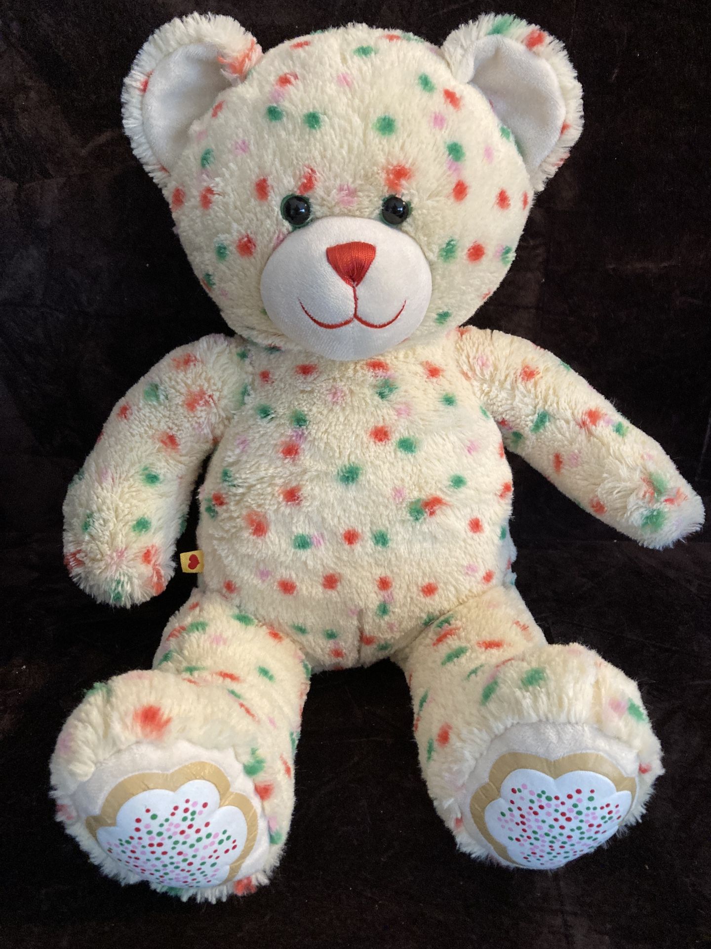 Build A Bear Plush Christmas Bear Sugar Cookie Speckled Confetti Sprinkles from 2012. Pre-owned, very good condition. Includes tush tag, no cookie. No stains, holes, from non-smoking home.