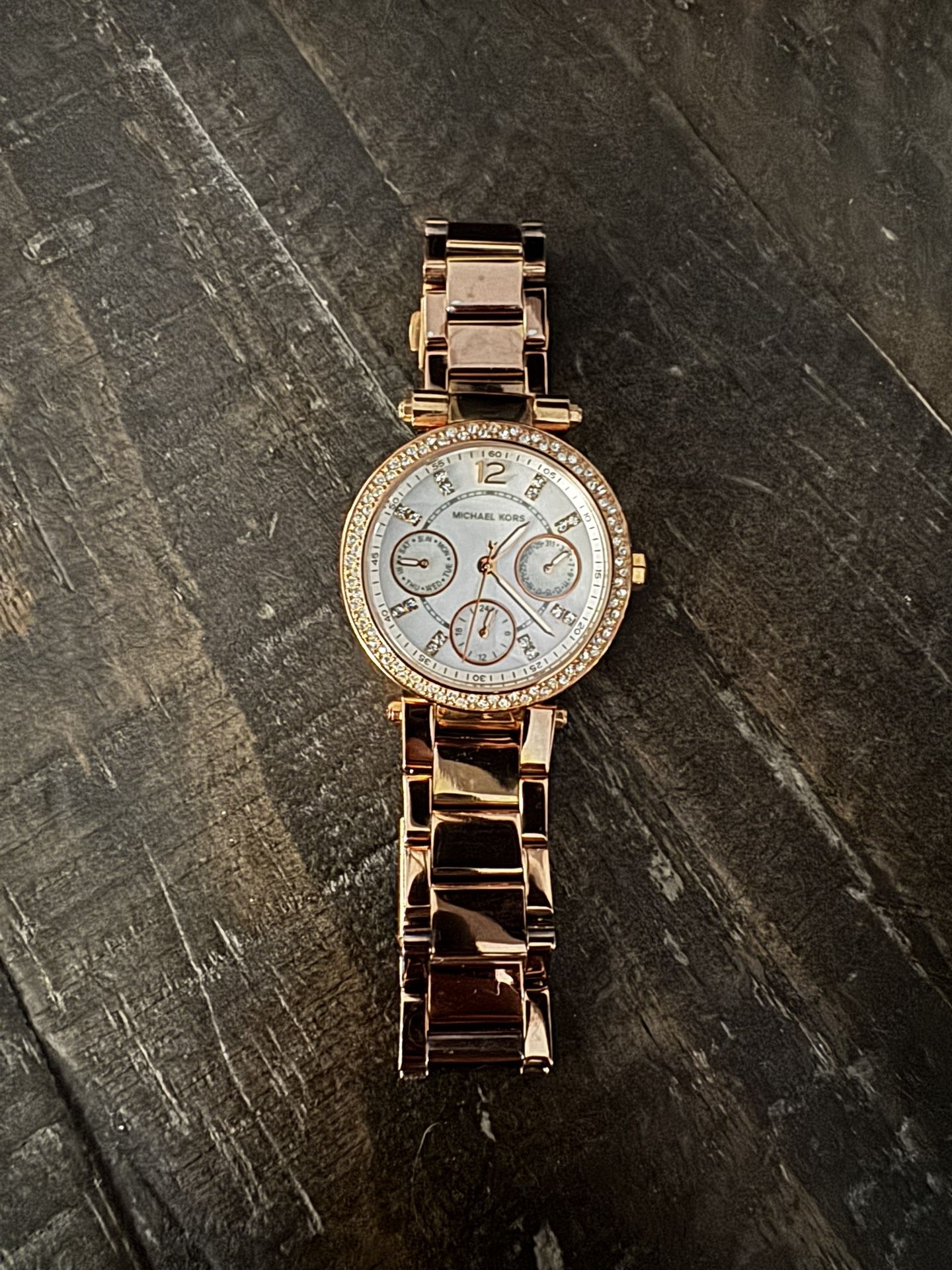 Michael Kors women’s rose gold tone stainless steel chronograph watch featuring a crystal-accent bezel and multi-function dial. Pre-owned and in good working condition with normal light wear. Bracelet style band. Watch only; no box or papers.