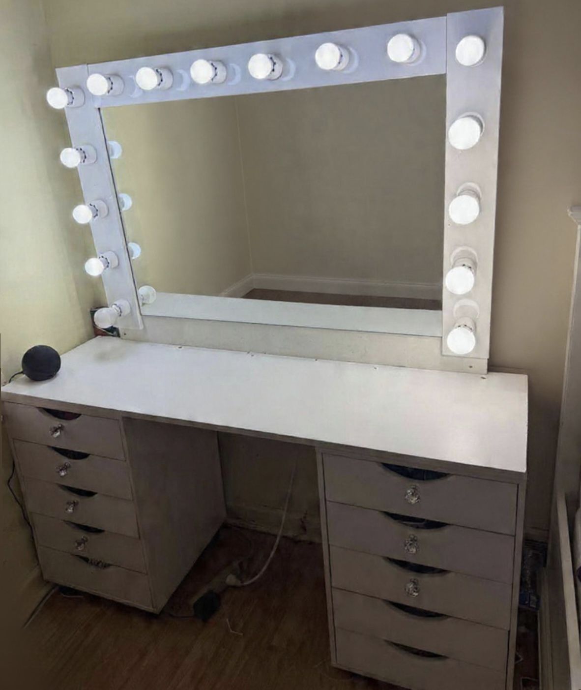 Beautiful handmade Hollywood-style vanity in white. The mirror and frame were custom made and assembled at home. All light bulbs are included and fully working, providing