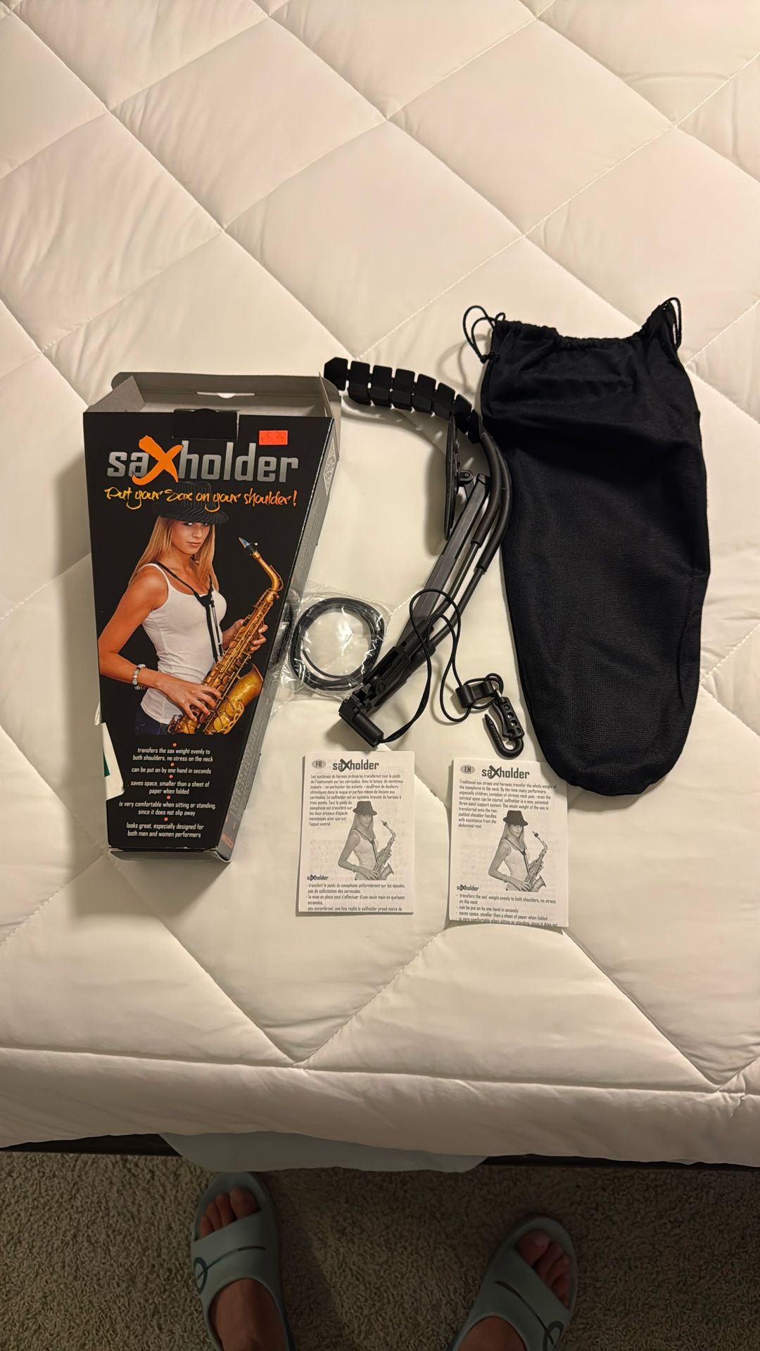 JazzLab Saxholder (Neck Strap) Saxophone Harness First Version Condition: New and still in box Use: Alto, Tenor, Soprano, bari saxophone, bass clarinet and bassoon. Features: * Redistributes instrument weight across the shoulders and abdomen, alleviating neck strain * Lightweight and durable construction * Compact storage * Allows for optimal playing position, directly in front of the body when standing * Adjustable strap for easy movement and attachment/detachment * Securely attaches to the saxophone * Comes with original storage bag, extra string, and instruction booklet. Questions or concerns? Please let me know.