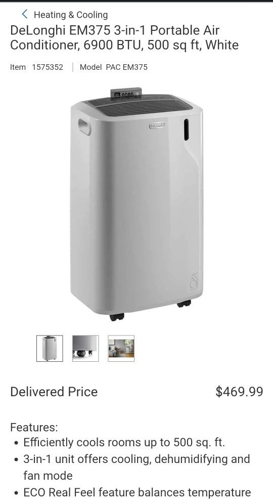 DeLonghi EM375 3-in-1 Portable Air Conditioner Cooler, 6900 BTU, 500 sq ft, White, Costco $470
