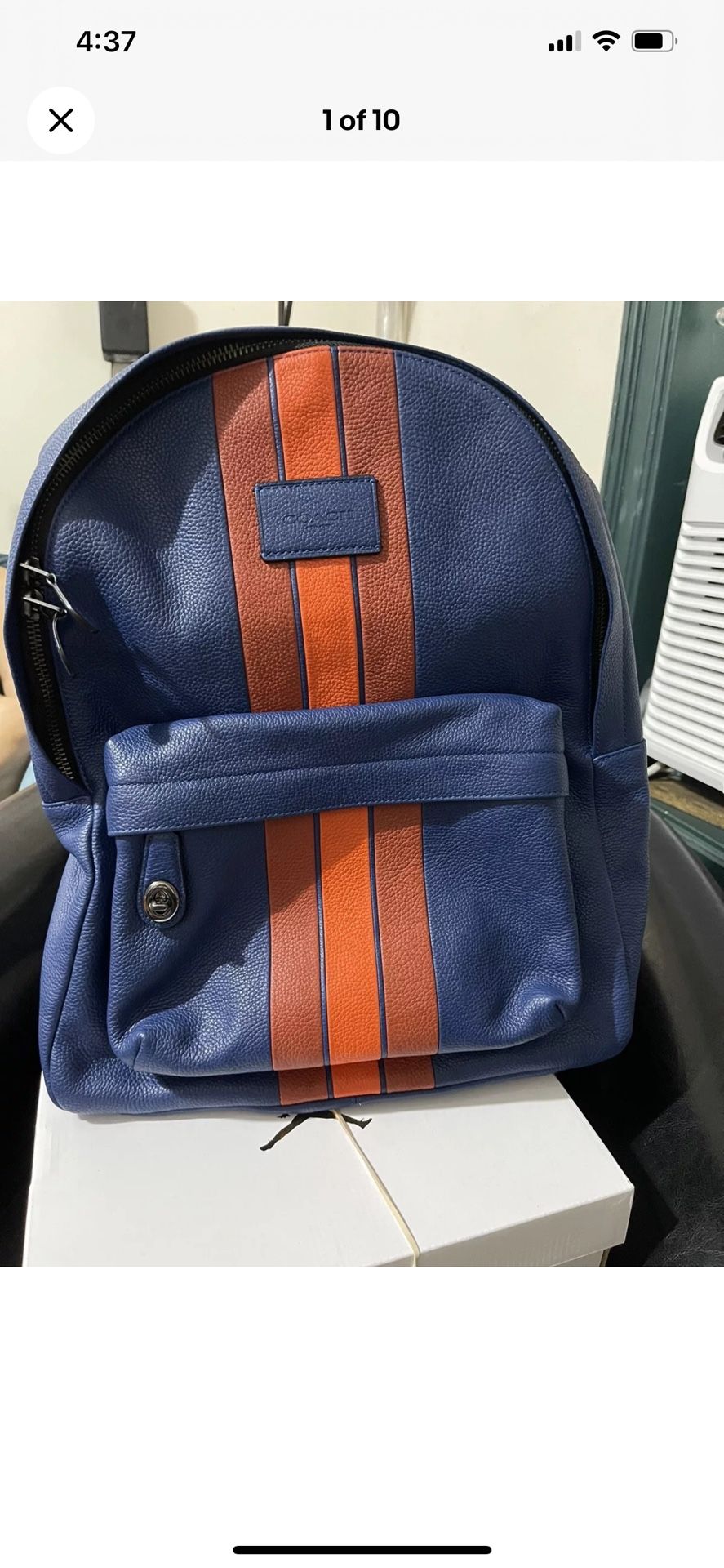 Coach Blue Org/72313 Pebble Leather Wizversity Stripe BNWT. For Men Pebble leather. Inside zip, cell phone and multifunction pockets. Inside laptop sleeve with secure tab. Zip closure, fabric lining. Top handle with 2 1/4" drop. Outside zip pocket. Adjustable shoulder straps. Fits a 15" laptop. 13 3/4" (L) x 17 1/4" (H) x 6" (W). Bold racing stripes add a sporty twist to the popular Coach Campus Backpack. This graphic update is crafted in richly pebbled leather, with wide padded straps for comfort, room for a laptop and an iconic turnlock securing the outside pocket. Color: blue