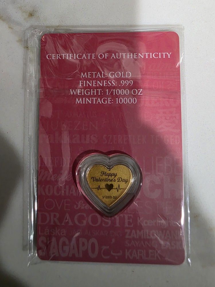 Nice gift for that special person. Real, pure gold heart. .999 purity, 1/1000 oz.