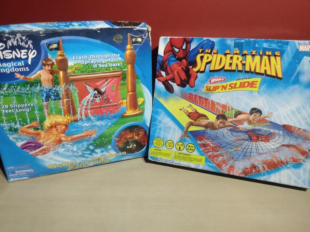 2 New Kids Water Slide Spiderman 16ft & Disney Magical Kingdoms Pirates of the Caribbean 20 Ft Slip N Slide - both are brand new factory sealed. selling everything for $20
