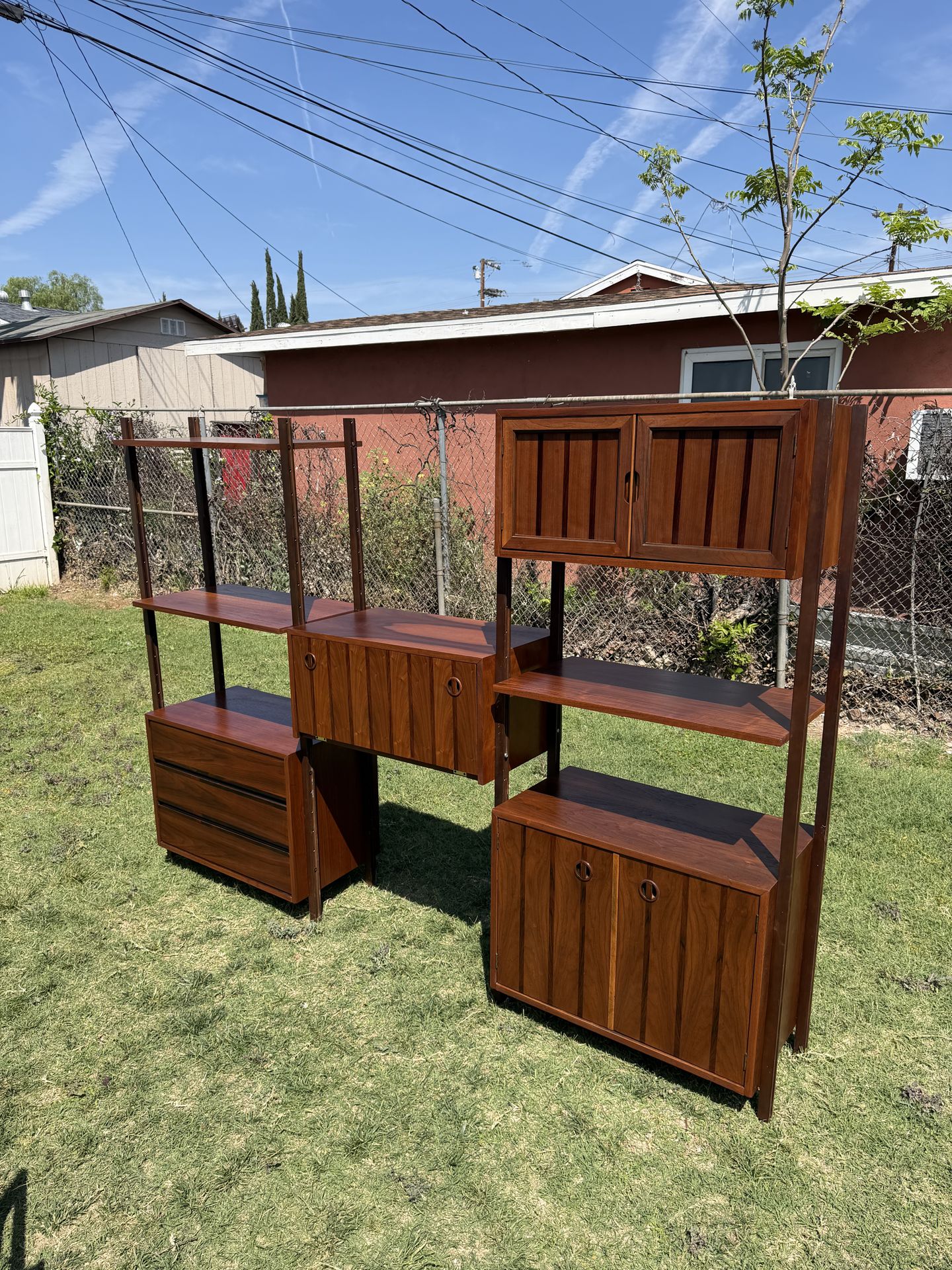 Mid-Century Modern Modular Wall Unit by Stanley Beautiful vintage modular wall unit by Stanley, featuring rich wood grain, clean lines, and versatile storage. This piece includes open shelving, enclosed cabinets, drawers, and a drop-down desk—perfect for a stylish home office or living space. Solid construction with timeless mid-century design, offering both function and statement appeal. Dimensions: 101” W × 72” H × 18” D Great vintage condition with minor wear consistent with age.