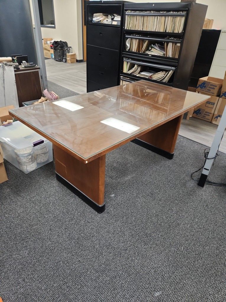 Heavy Duty solid very heavy wood table. About 50 years old. 69" long x 36" wide x 29" high. With thick glass top. Wood needs a little TLC but in perfect condition. Would look great in an office or conference room, etc.