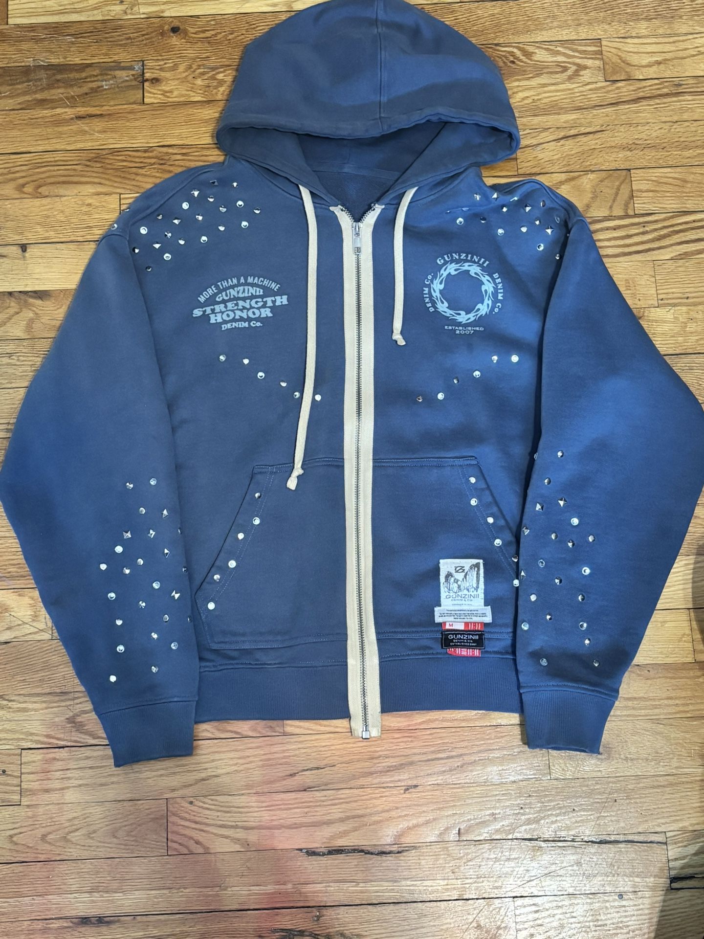 GUNZINI navy blue zip up hoodie with white studs and dog design #dog #studded