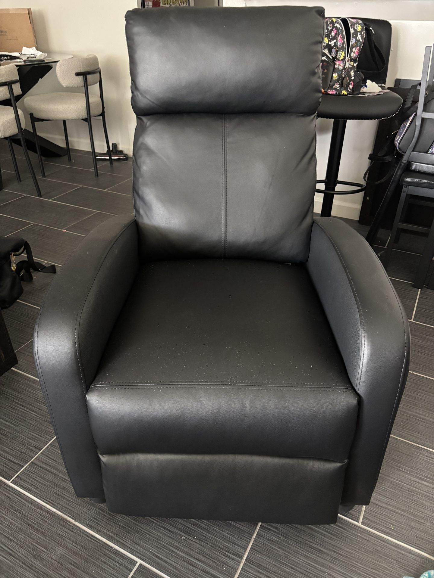 Small black leather recliner, like new barely used, backrest can be taken off for easier transport if needed.
