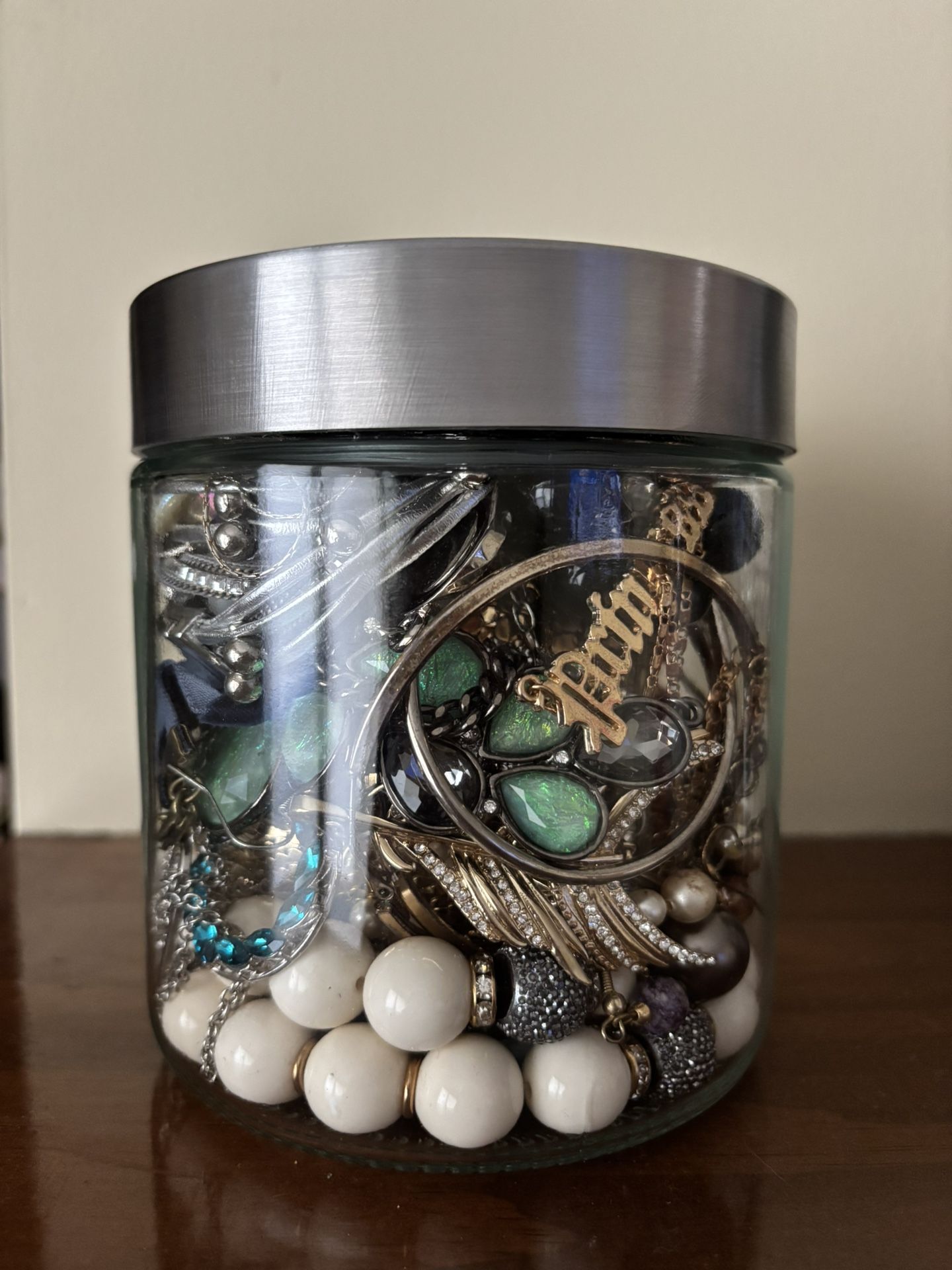 $20 but valued for way more. These are on Tik Tok being “unboxed”. Jar is heavy. Full of wearable necklaces,bracelets and earrings.