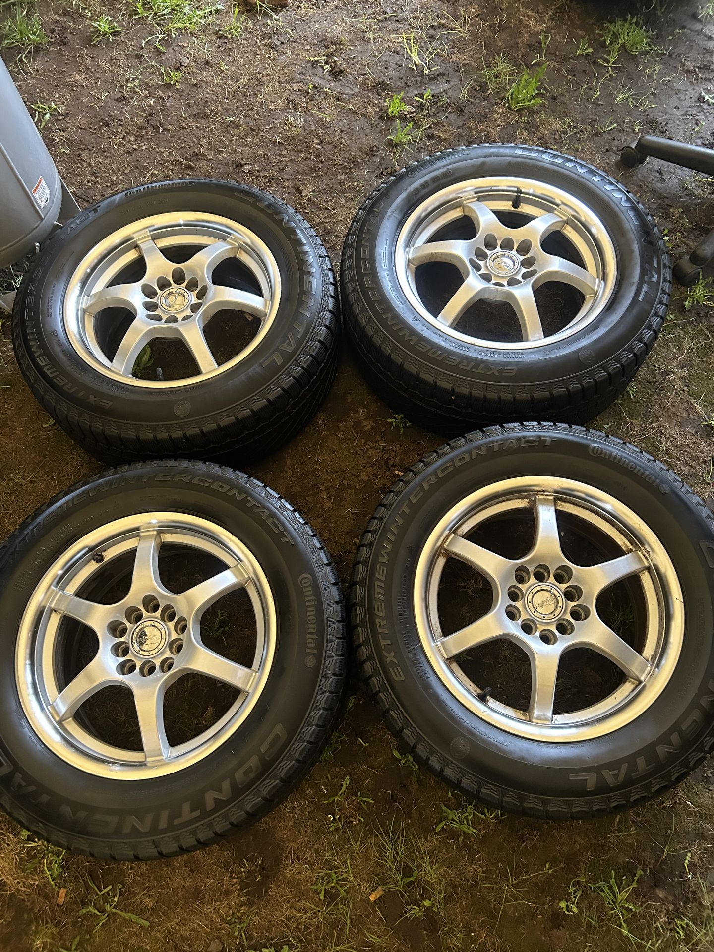 Set of tires with rims (225/60/R16), bolt pattern 5x4.5 and 5x100, in good condition and balanced.
